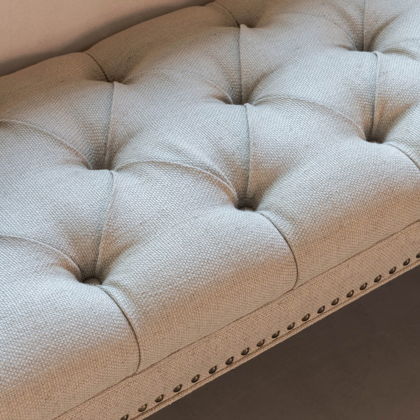 The Strathmore Padded Bench combines timeless elegance with contemporary design, featuring deep button tufting and natural linen-look fabric. Its gently curved silhouette and antique-style stud details are complemented by sturdy oak-effect legs, making it a refined addition to any bedroom, hallway, or living area. Crafted from oak wood, cotton, and polyester, it measures 140cm wide, 64cm high, and 45cm deep, weighing 10.5kg for stability and ease of placement. Ideal for extra seating or as a stylish accent at the foot of your bed.