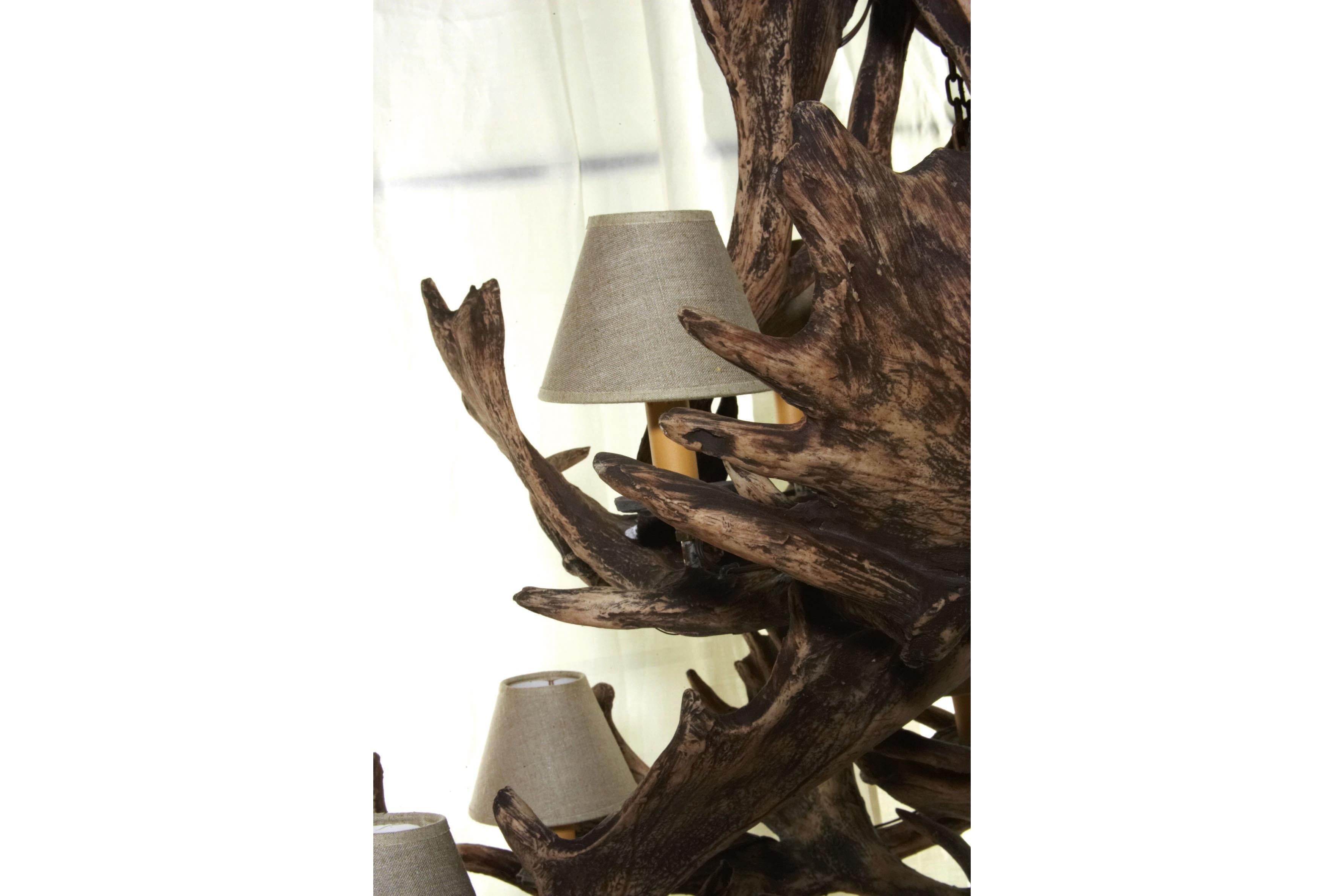 The Flamant Sauvage Chandelier offers a striking presence with its 10-lamp design in a rich brown resin finish. Measuring 125 cm in length and width with a 100 cm height, it provides substantial coverage for larger spaces. This chandelier includes recommended lampshades sized W 14 x D 7 x H 11 cm, enhancing its elegant silhouette. Equipped with E14 fittings, it combines durability with sophisticated style, making it ideal for those seeking a bold, timeless centerpiece. Despite its 36 kg weight, the resin construction ensures stability while adding a warm, textured look to any room.