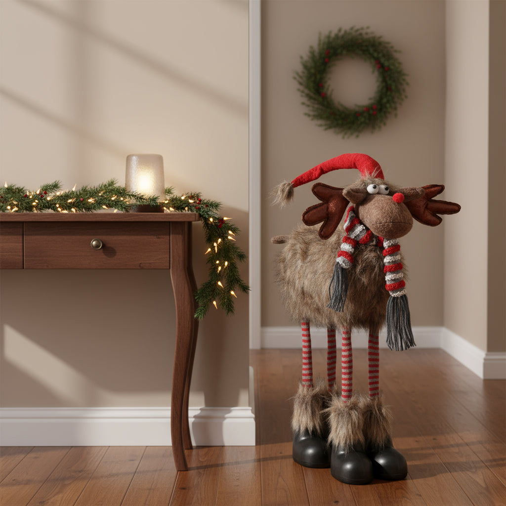 The Christmas Wrapped Reindeer stands 0.7 meters tall, with a width of 0.4 meters and a depth of 0.3 meters. This expertly crafted piece adds subtle charm to your Christmas decor, perfect for enhancing festive spaces with its elegant presence.