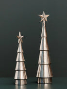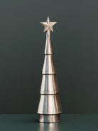 The Large Silver Christmas Tree Sirius stands 36 cm tall with a 9 cm diameter, crafted from durable tin and aluminum. Its sleek metallic finish brings a modern yet elegant touch to your holiday décor. Ideal for adding height and shimmer to tabletops or mantelpieces, this piece combines sturdy materials with festive style for a lasting seasonal accent.