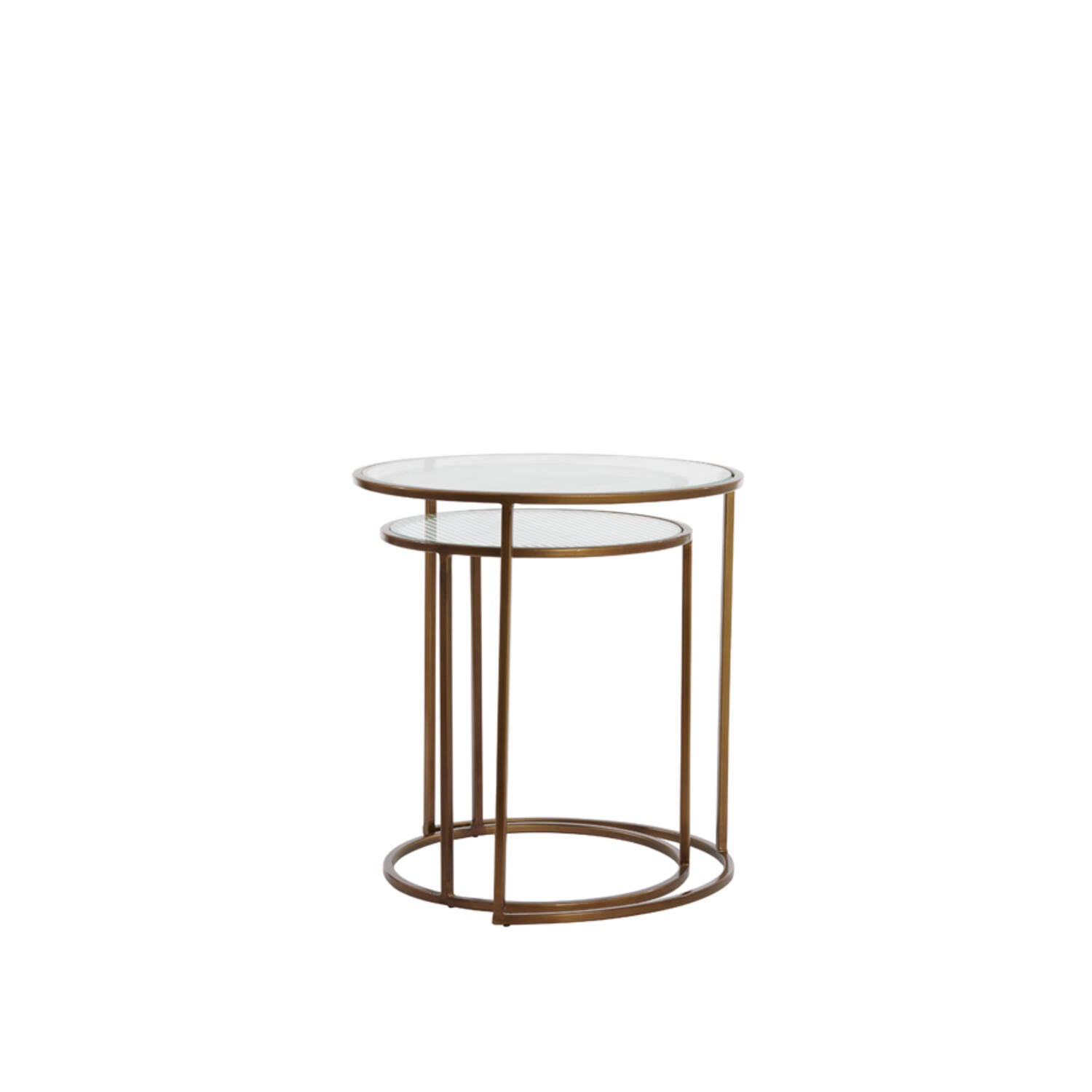 Ferati Side Table Set of 2 A pair of contemporary metal side tables in brushed gold, designed for versatile placement in modern interiors. The set comprises two round tables with distinct proportions—40x45cm and 50x52cm—allowing flexible styling across living spaces. Crafted from durable metal with a warm gold finish, each table combines clean lines with substantial presence. Ideal for layering beside seating, as accent pieces, or grouped for visual interest. The compact footprint suits compact apartments and larger rooms alike.