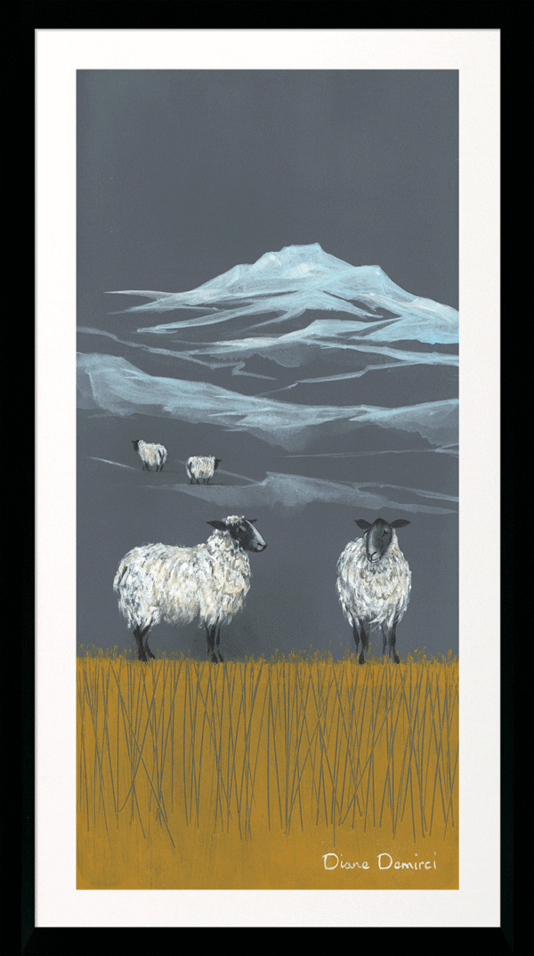 Pastures New Panel Wall Art by Diane Demirci captures serene animal landscapes with subtle shades of grey, white, and yellow. Expertly finished in a narrow black wood frame with protective glass and a crisp white mount, this portrait-oriented piece measures 69 cm by 39 cm. Its refined presentation and exclusive design make it a sophisticated addition to elevate any interior space.