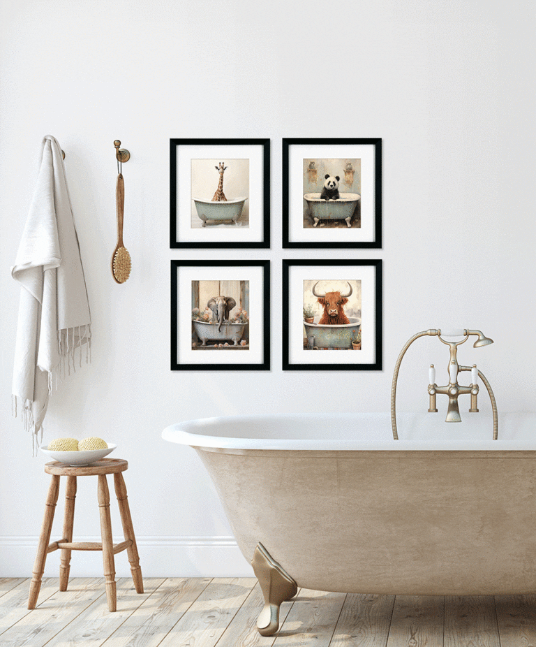 Celebrate whimsy with the Bathroom Joy Giraffe Wall Art by artist Lazar. This portrait print features playful blue, brown, and white tones, framed elegantly in a narrow black frame with a crisp white mount. Measuring 34 cm by 30 cm, it adds a delightful touch to any bathroom or living space, combining artistic charm with expert craftsmanship.