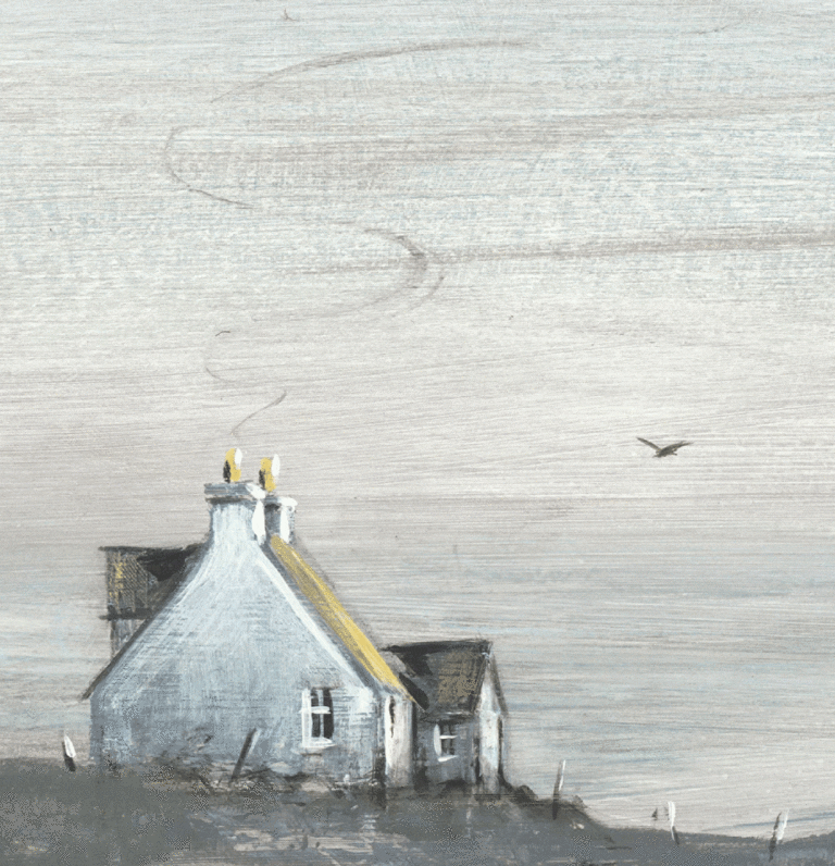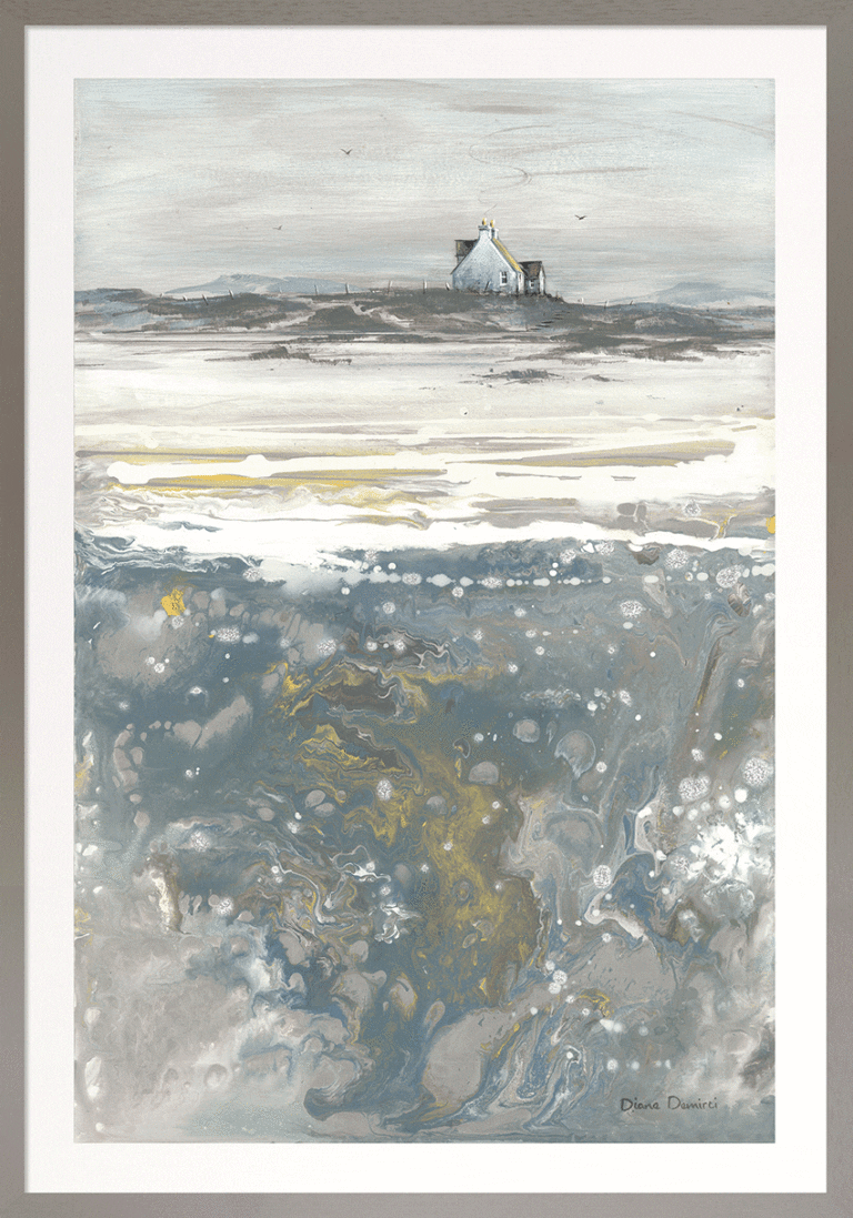 Capture the serene beauty of the coast with this elegant wall art by Diane Demirci. Featuring calming blue and white tones, the artwork is beautifully enhanced by silver-colored metal leaf hand embellishments. Set within a narrow light ash wood frame and a white mount, this portrait-oriented piece measures 69 cm by 49 cm, making it a perfect addition to any space seeking a refined coastal or landscape ambiance.