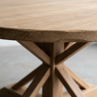 Handcrafted from solid elm wood, this substantial round table is defined by its generous proportions and architectural cross-base. The natural grain and softly weathered finish highlight the character of the timber, while the circular form encourages relaxed, communal dining.