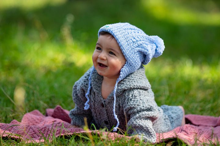 Stylish, warm and super comfortable, our cosy hand-knitted Aran helmet hat in 100% merino wool is a contemporary take on the classic bobble hat, with ear flaps on either side to protect delicate ears in cooler weather. The natural elasticity of the wool means it will fit any child aged from 1 to 6 years. A wonderful gift for newborns, christenings, birthdays or Christmas.