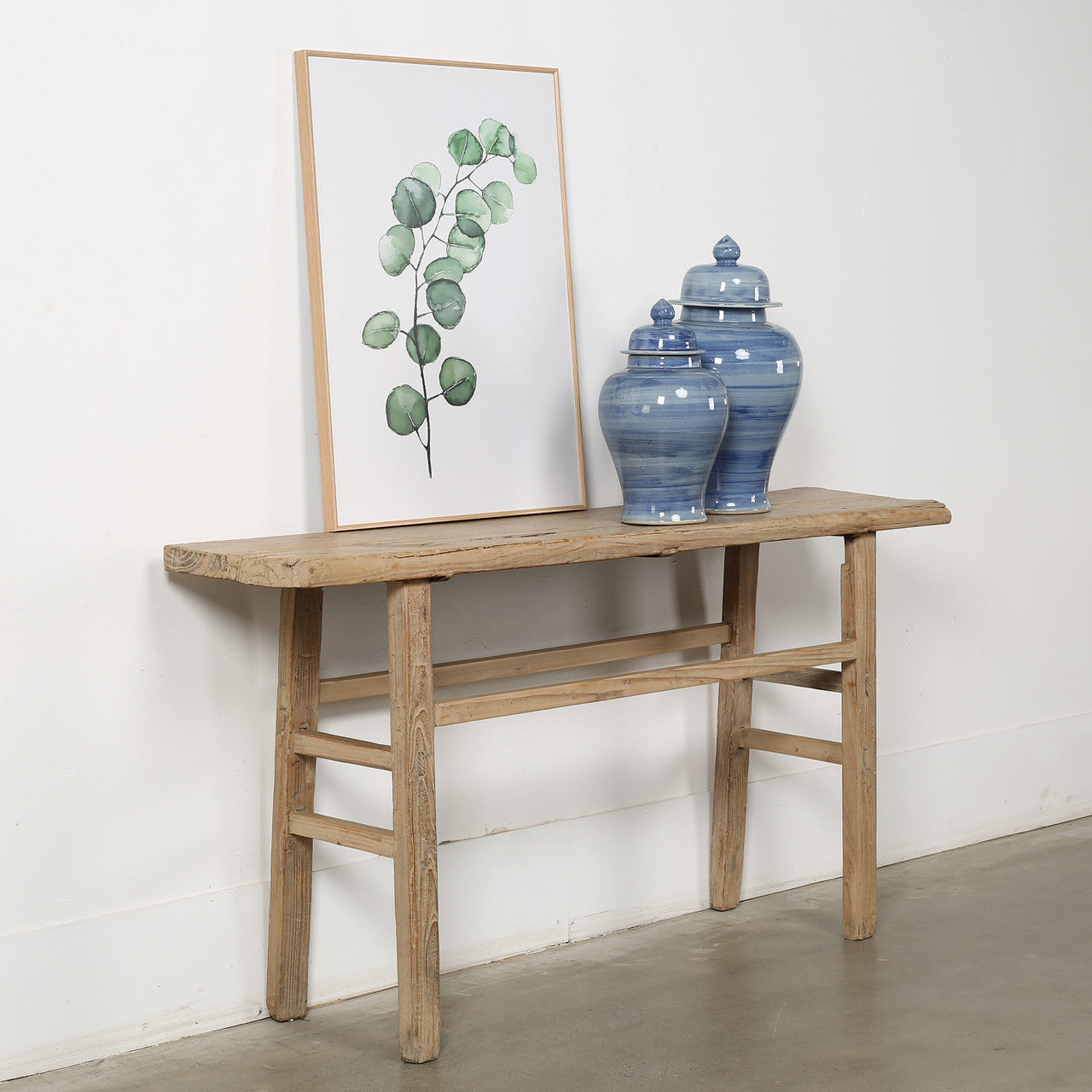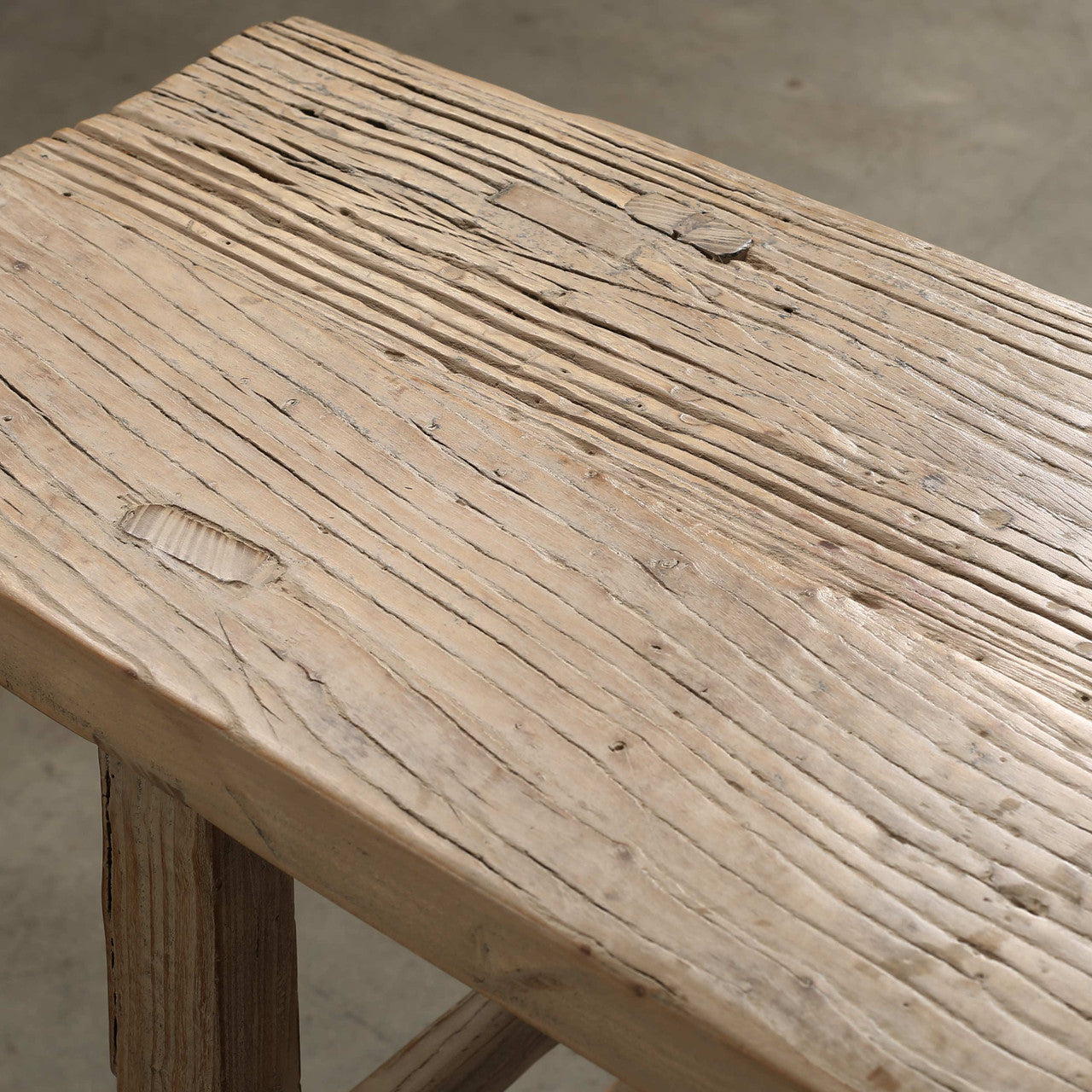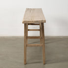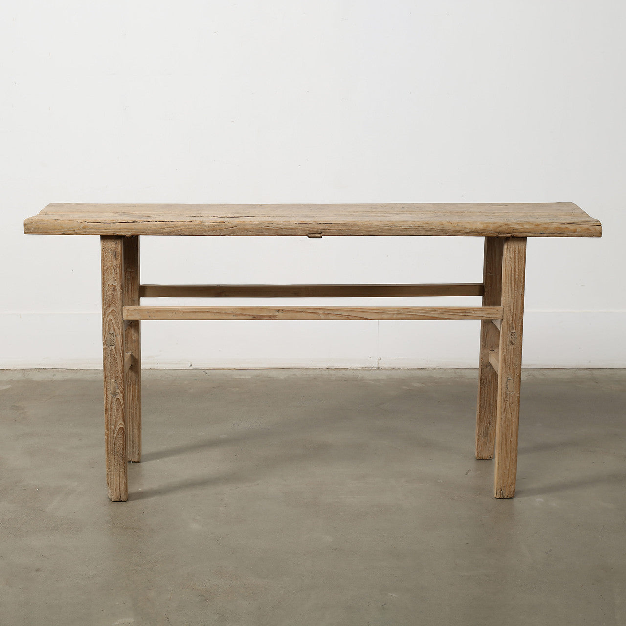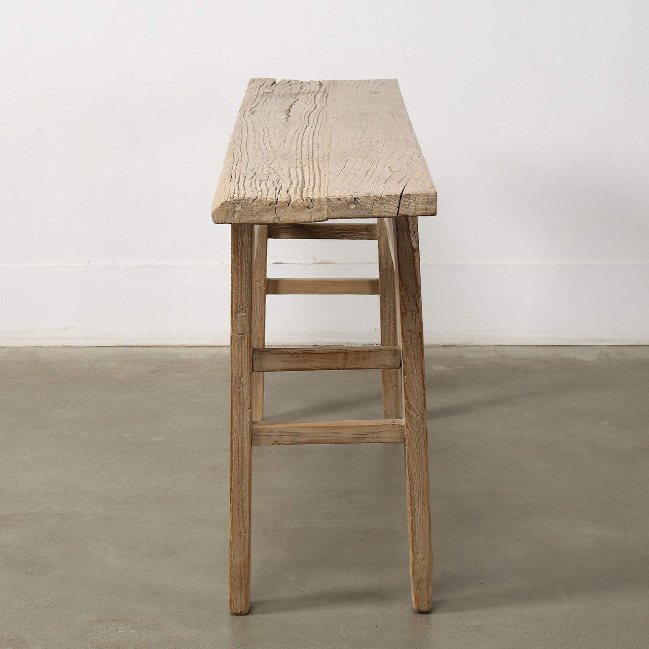 Crafted from reclaimed elm, this console table draws its lineage from traditional country-house service furniture, reimagined for contemporary living. Its generous 180cm length and modest 40cm depth & 45 cm height make it ideally proportioned for hallways, dining rooms, or behind sofas, a versatile anchor for display and storage. The tabletop reveals the authentic character of reclaimed wood: visible grain, knots, and subtle surface variations that chronicle its history. A straightforward trestle base with ladder bracing delivers structural integrity through honest joinery, eschewing decorative excess. This is furniture built for purpose, grounded, durable, and quietly assured in any interior.
