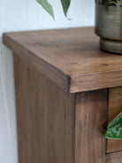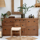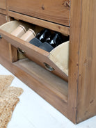 The Marseille Cabinet With Drawers combines elegant design with versatile storage. Handmade from solid pinewood, it features four adjustable shoe drawers that accommodate up to four pairs each, including medium-height boots. Seven additional drawers of various sizes provide organized space for scarves, gloves, keys, and other essentials. Its antique brass handles and refined details make it a stylish and practical choice for hallways, bedrooms, or walk-in closets, enhancing your space with both function and timeless charm.