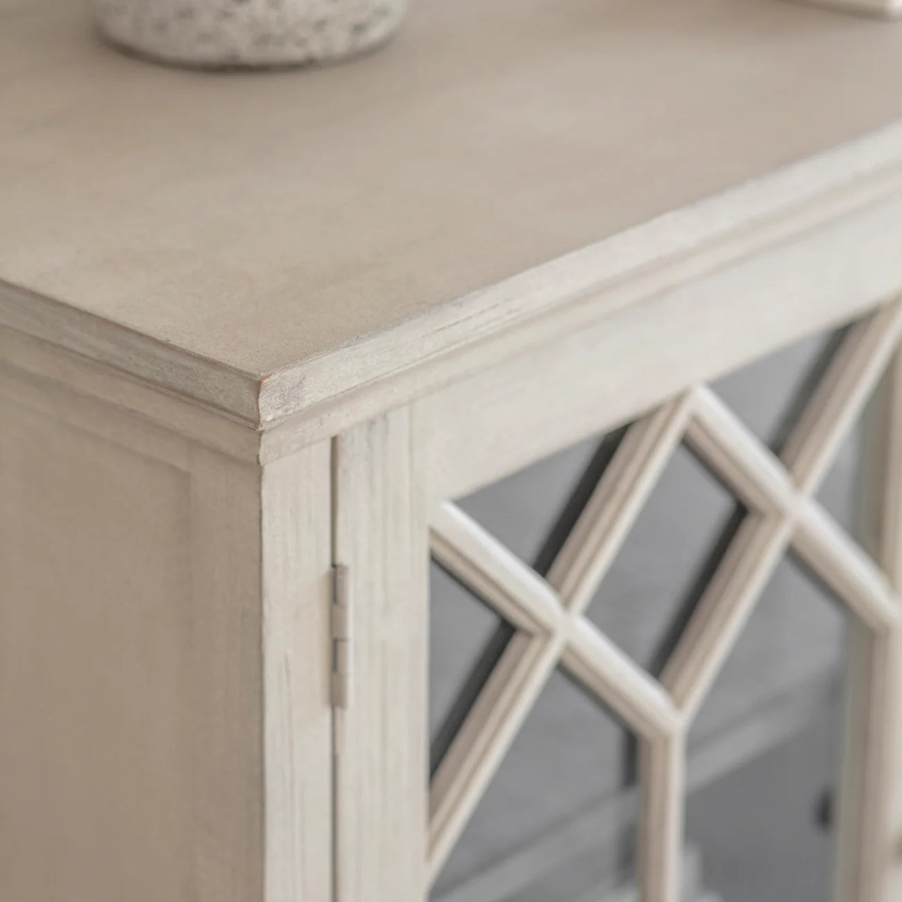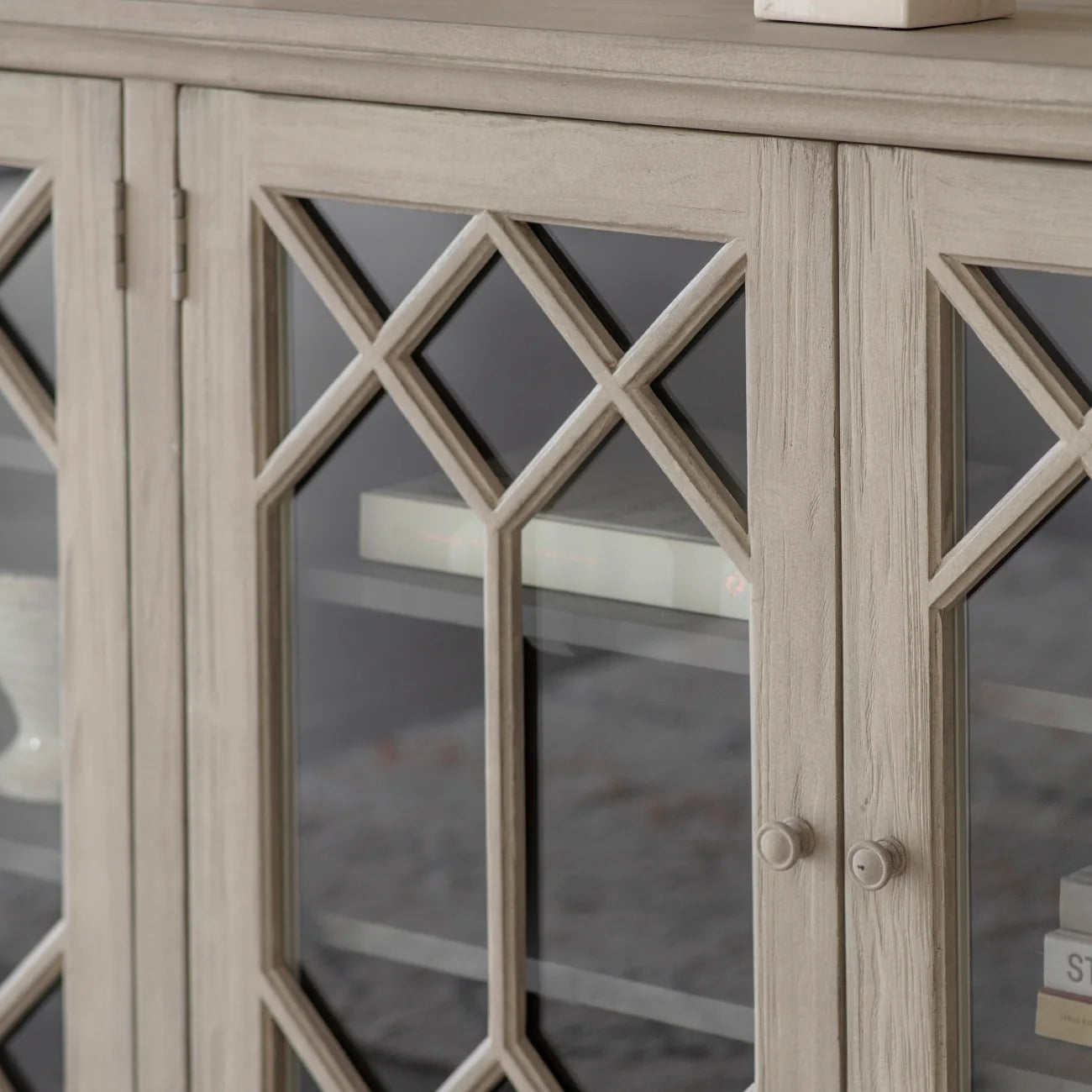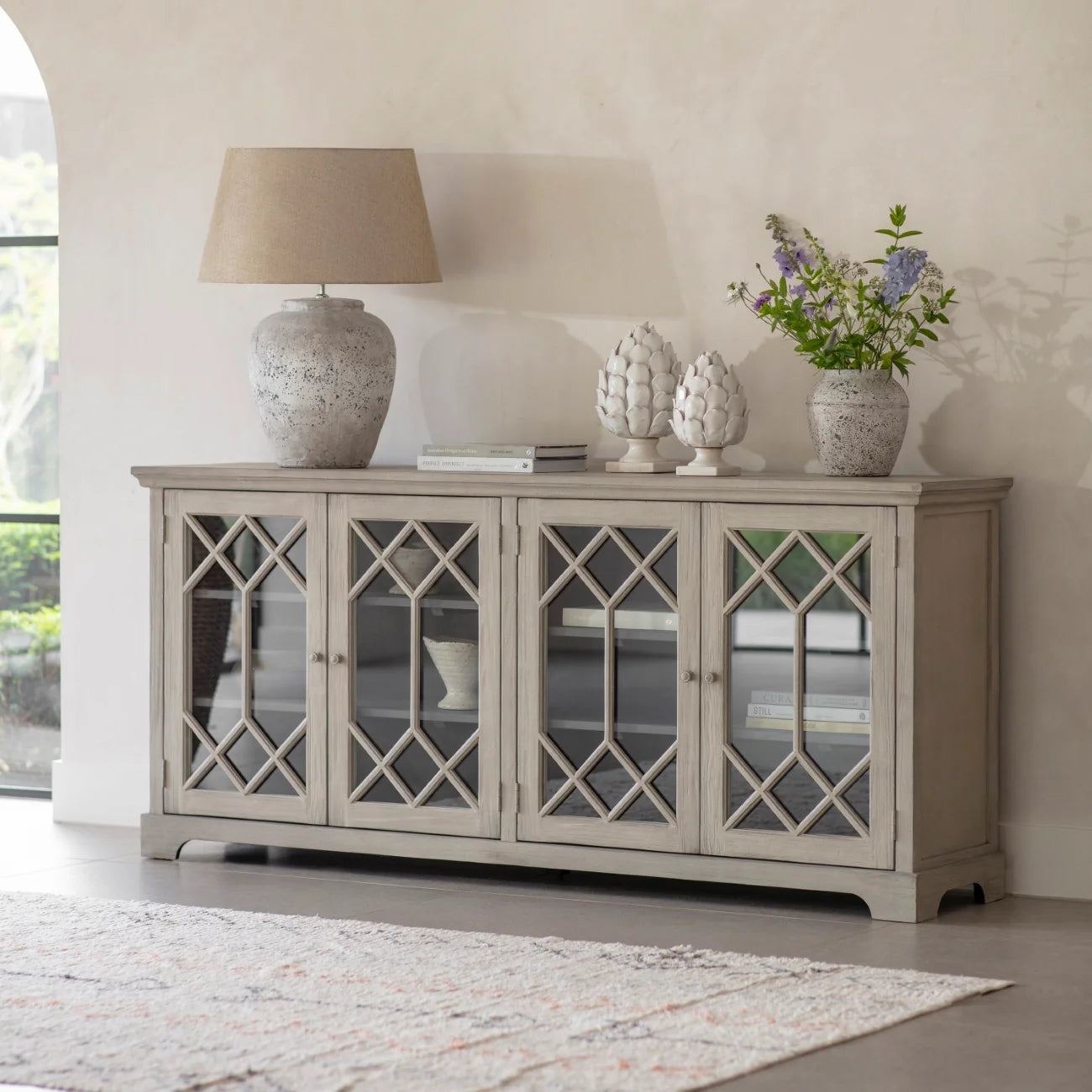 The Whitmore 4 Door Sideboard blends classic design with functional storage, crafted from reclaimed pine for a sustainable touch. Its four glass-fronted doors feature decorative latticework, showcasing a soft neutral painted finish that complements both traditional and modern interiors. Measuring 200cm wide, 90cm high, and 45cm deep, this sideboard offers ample space to organize dining, living, or hallway essentials without compromising style. Delivered fully assembled, it provides an effortless way to add timeless elegance and refined character to your home.