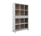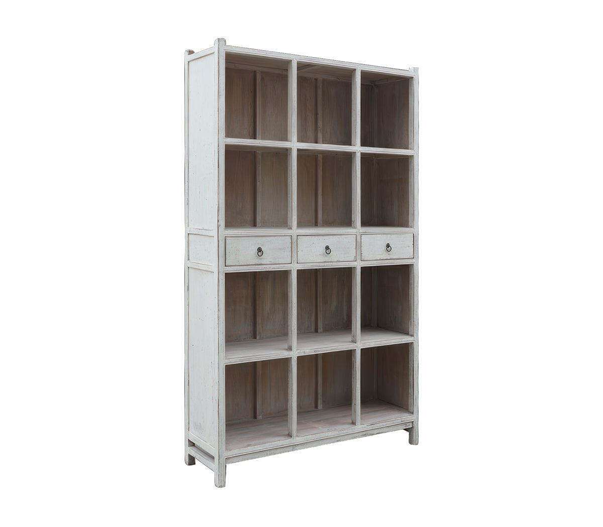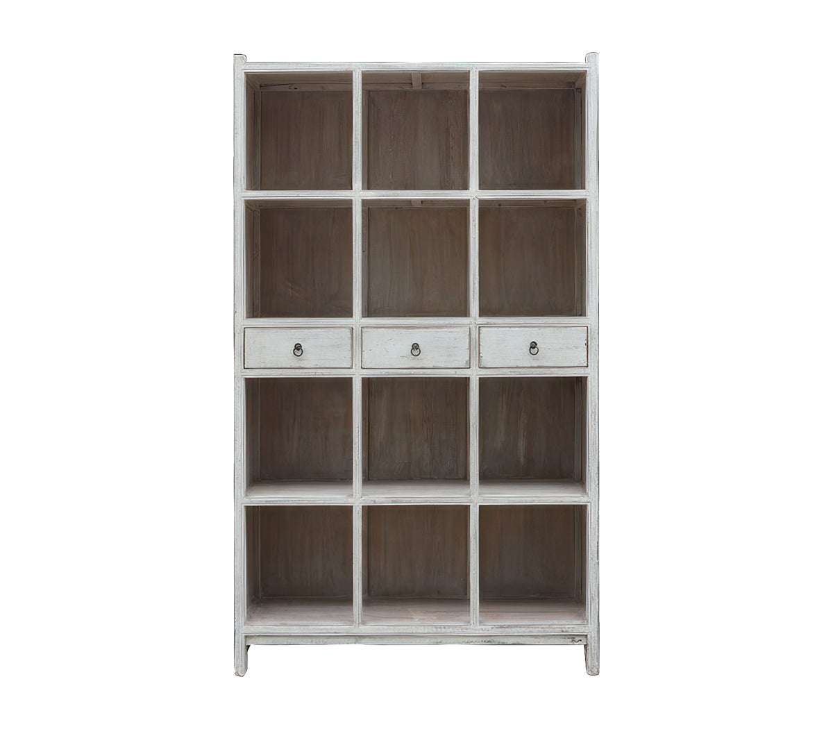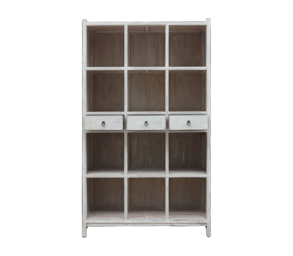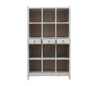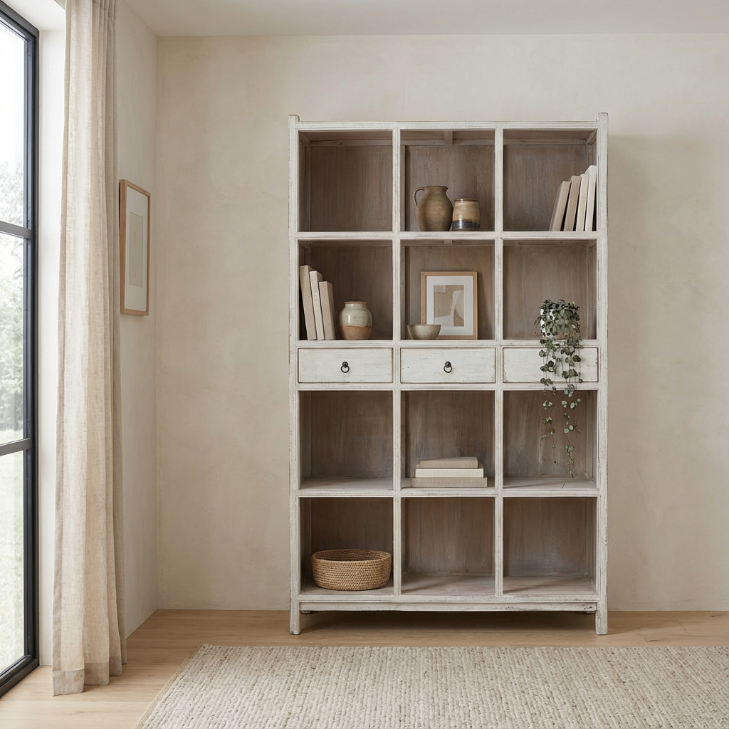Crafted from solid pine wood, its gently weathered finish highlights the natural grain and subtle imperfections of the timber, giving each piece its own character without feeling rustic or overstated. The clean grid layout offers generous open storage, making it equally suited to books, ceramics, baskets, or everyday objects you want on display but neatly contained.