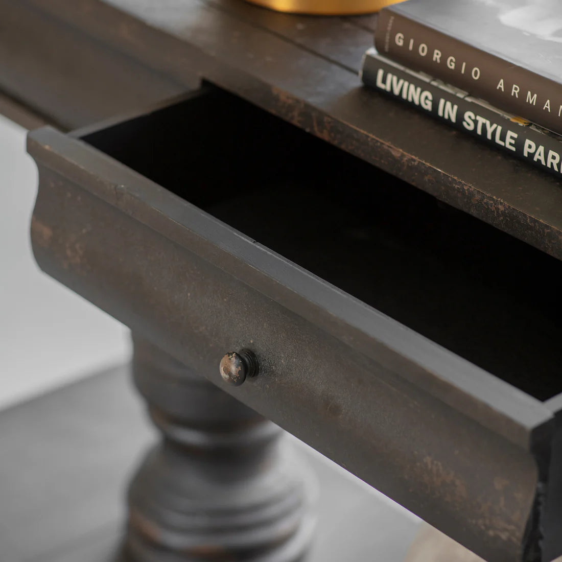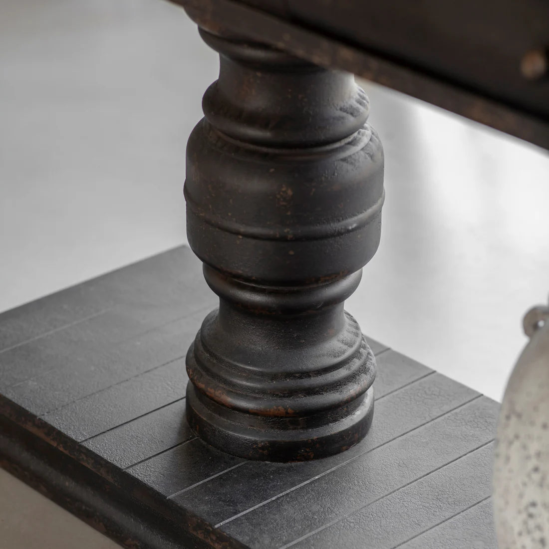 The Heritage Console Table combines a striking dark, distressed finish with classic craftsmanship, adding timeless character to any room. Crafted from pine and engineered wood, it offers ample surface space for displaying cherished photo frames, statement lamps, and meaningful décor. With generous dimensions (W241cm x H88cm x D45cm) and a stable design featuring a 138cm leg span, it balances both form and function, making it a versatile centerpiece to showcase your style. Full assembly is required for a seamless setup.