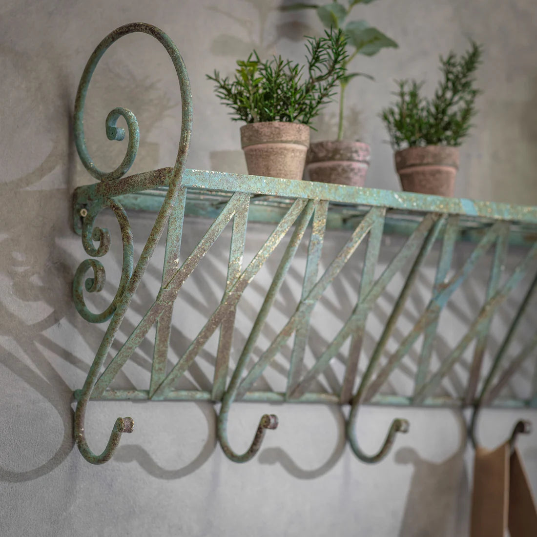 Add a touch of vintage elegance and functionality to your hallway with the Clovelly Iron Wall Hooks with Basket. Crafted from iron with an aged verdigris finish and detailed scrollwork, this wall shelf offers a spacious top for décor or storage and six robust hooks perfect for coats, scarves, bags, or keys. Its open lattice design ensures a light, airy aesthetic, while the distressed patina enhances any interior with timeless character. Measuring 80cm wide, 36cm high, and 26cm deep, and weighing just 2.4kg, it combines style and practicality in one compact solution.