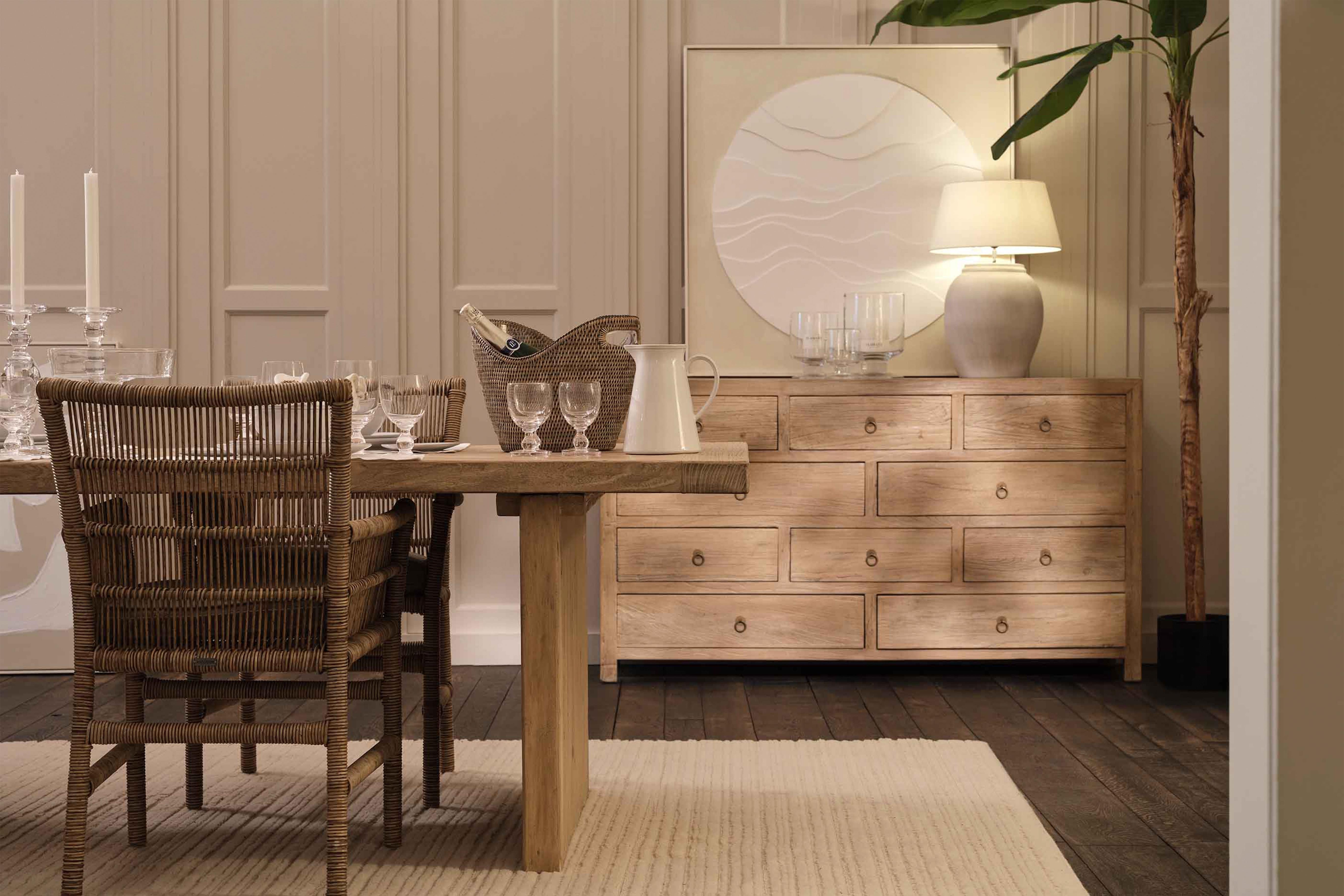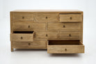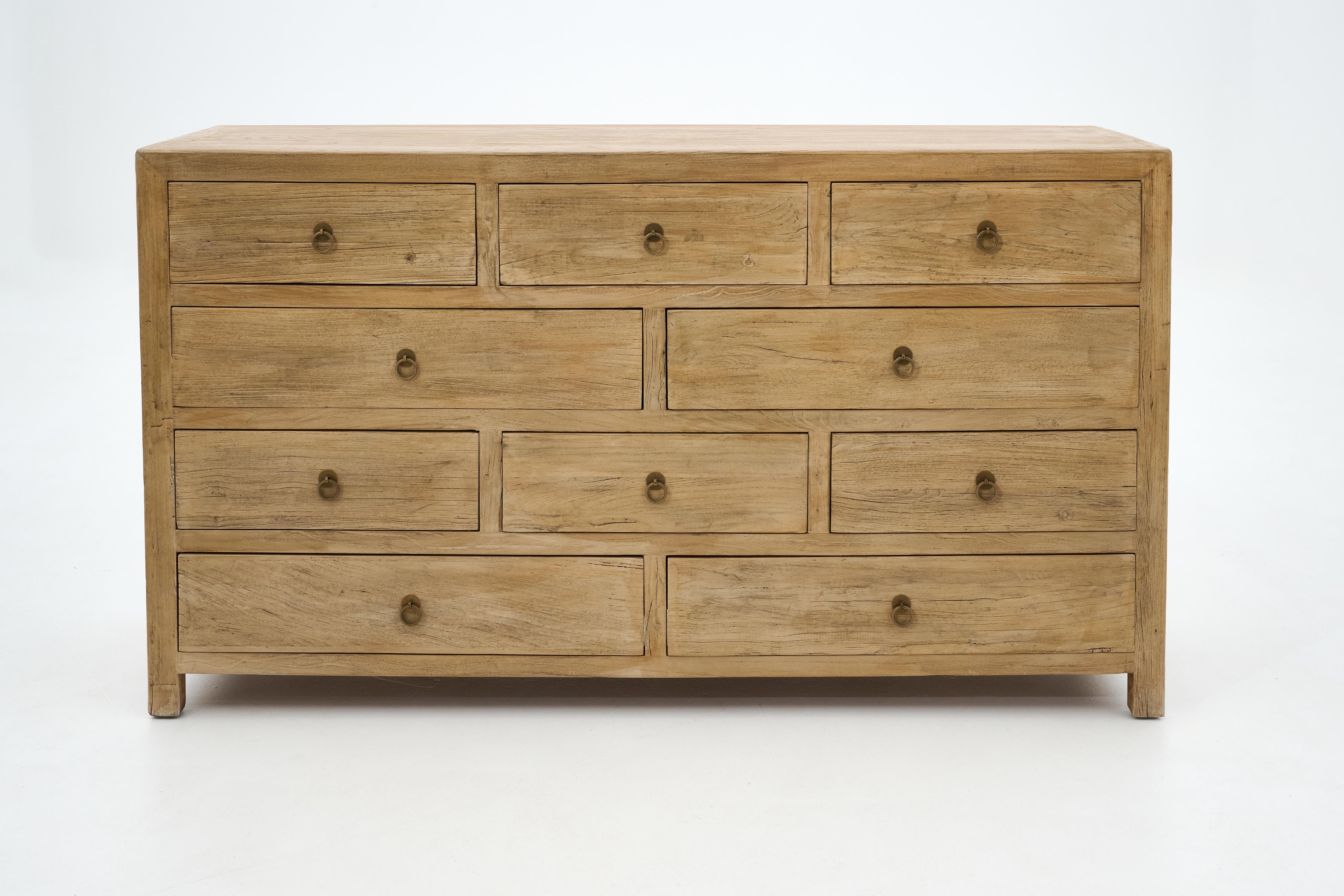 The Flamant Libby Chest features ten spacious drawers crafted from premium elm, offering both durability and timeless natural beauty. Its heritage style, complemented by metal hardware, adds classic charm while providing practical storage. Measuring 160 cm in length, 90 cm in height, and 45 cm in width, this chest is perfect for organizing various items with elegance. Available in multiple variations to suit different decor needs.