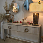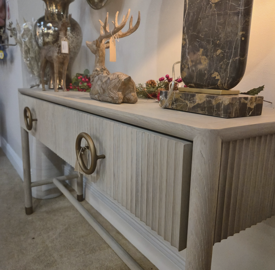 The Harlow Console marries understated elegance with thoughtful craftsmanship. Crafted from oak with soft grey-wash finishing, its fluted drawer fronts create subtle visual rhythm while aged brass ring pulls add warmth and character. Slim legs topped with metal caps maintain a refined silhouette, striking the perfect balance between transitional and contemporary. At 1500mm wide, it anchors an entryway or living space with quiet sophistication. A versatile piece that complements both modern and traditionally-inspired interiors.
