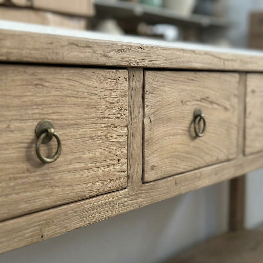 Four smoothly integrated drawers provide practical storage for everyday essentials, while the open lower shelf offers space for books, baskets, or decorative objects. The gently worn finish adds depth without feeling distressed, allowing the piece to sit comfortably in both classic and contemporary interiors.