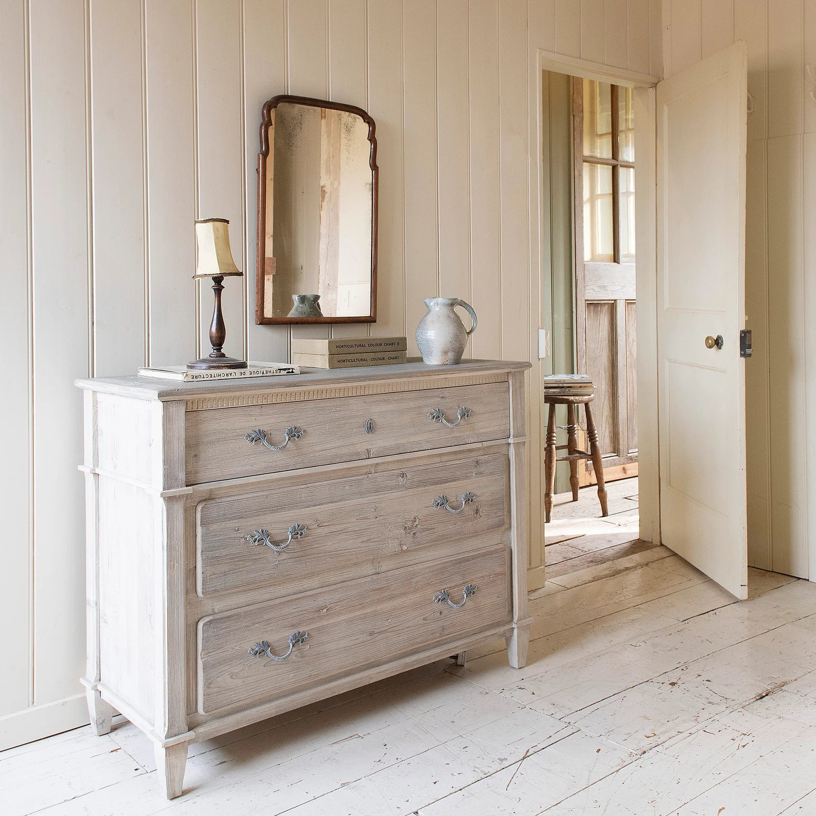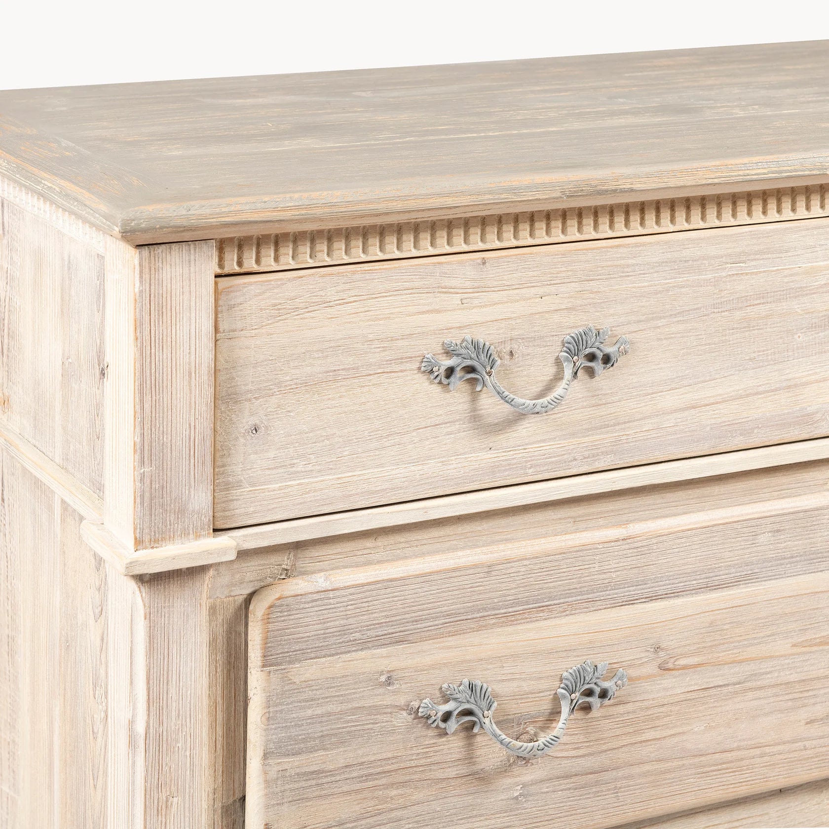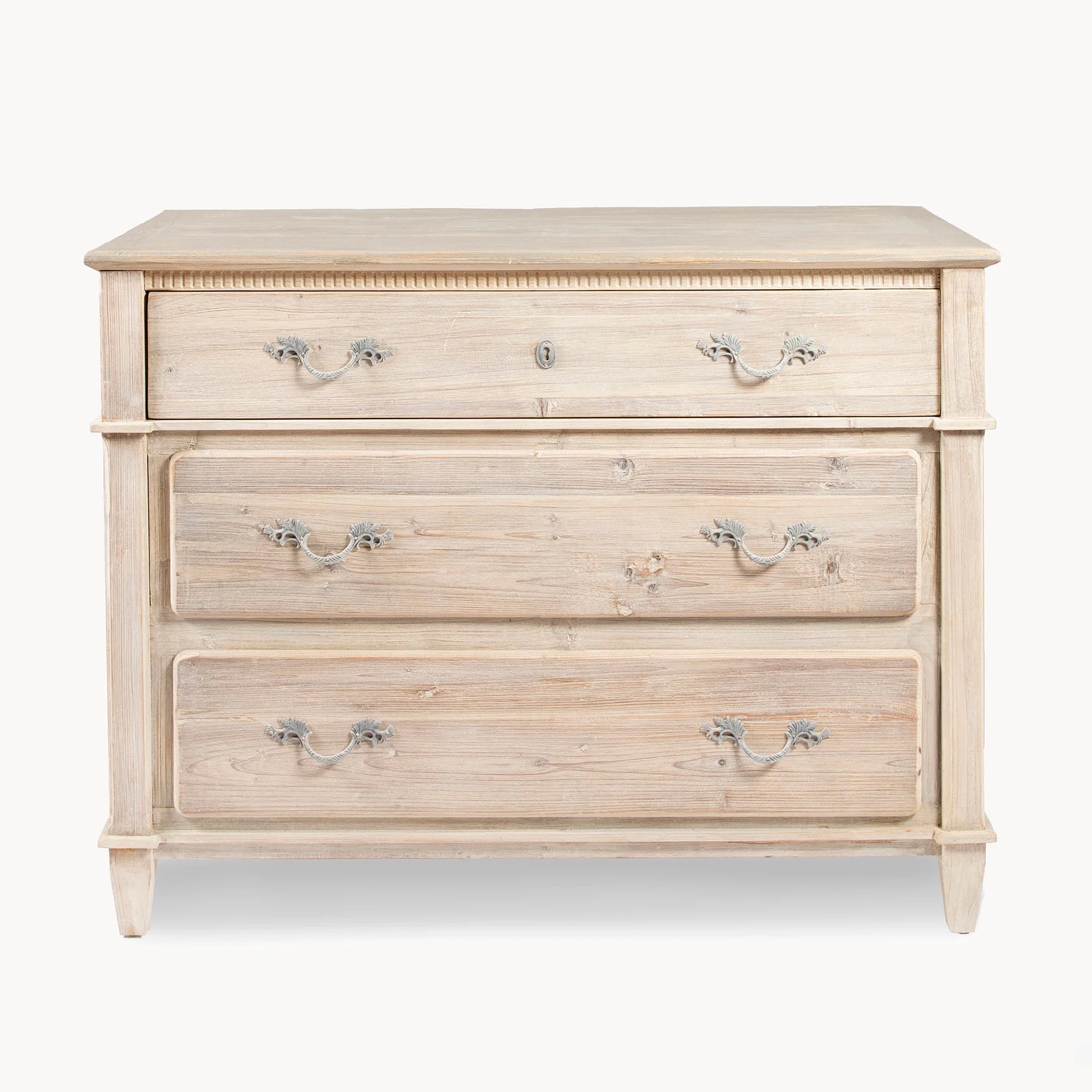 The Heirloom Chest of 3 Drawers made from reclaimed pine wood combines simplicity with elegance, crafted from white-washed reclaimed pine for durability and timeless appeal. Measuring 107cm wide, 83cm high, and 46cm deep, this sturdy piece features three spacious drawers with distinctive handles, offering practical storage without compromising style. Its sustainable material and classic design ensure it remains a valued addition to your home for years. Ready to use with no assembly needed, it balances form and function seamlessly.