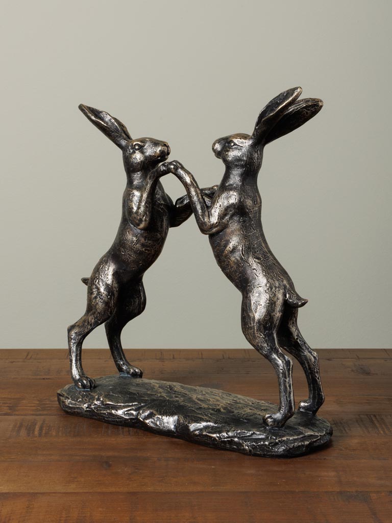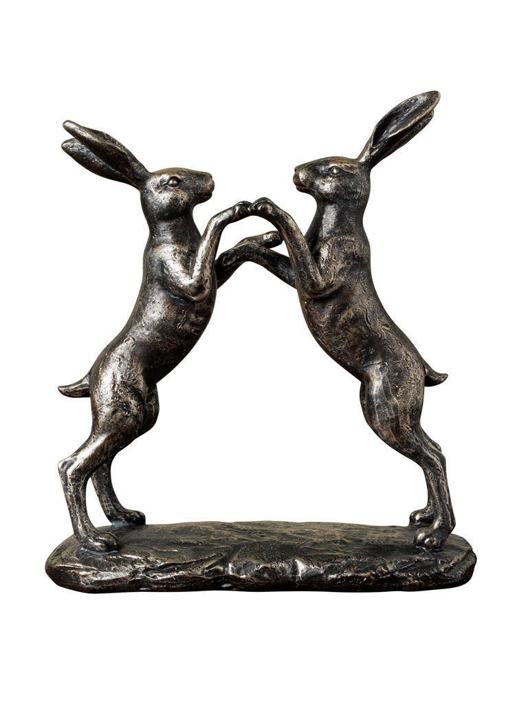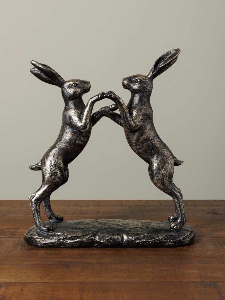 A striking polyresin sculpture capturing two rabbits locked in playful combat. Standing 24.5 cm tall with a compact 22 cm depth and 8.5 cm width, this piece brings narrative movement and whimsy to shelving, mantels, or console displays. The detailed casting showcases the dynamic tension of the moment, ears back, bodies intertwined, creating visual interest from multiple angles. Durable polyresin construction ensures longevity whilst maintaining the fine detail of each figure. A conversation-starting accent for collectors of animal sculpture or those seeking character-driven home decor with genuine artistic merit.