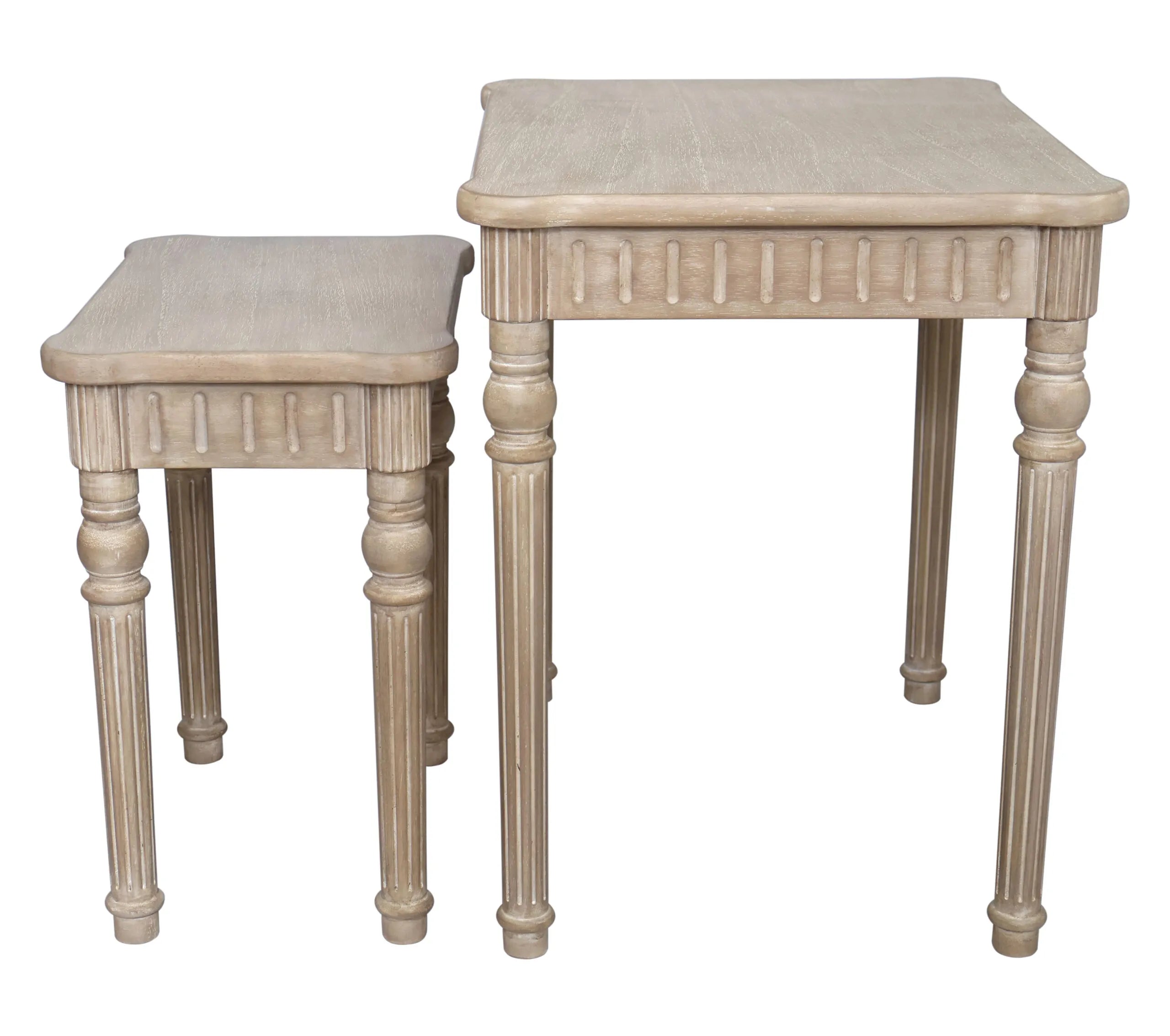 A pair of nesting tables designed for flexible living. The larger table measures 50 x 51 x 40cm, with a complementary smaller piece that tucks neatly underneath when not in use. Crafted in timber with a warm, weathered wash finish, these tables work as individual side surfaces or combined for extended display space. Ideal for layering in living rooms, bedrooms, or entryways where adaptability matters. The natural grain and soft patina complement both contemporary and traditional interiors.