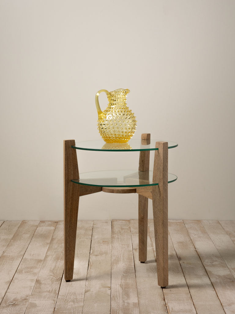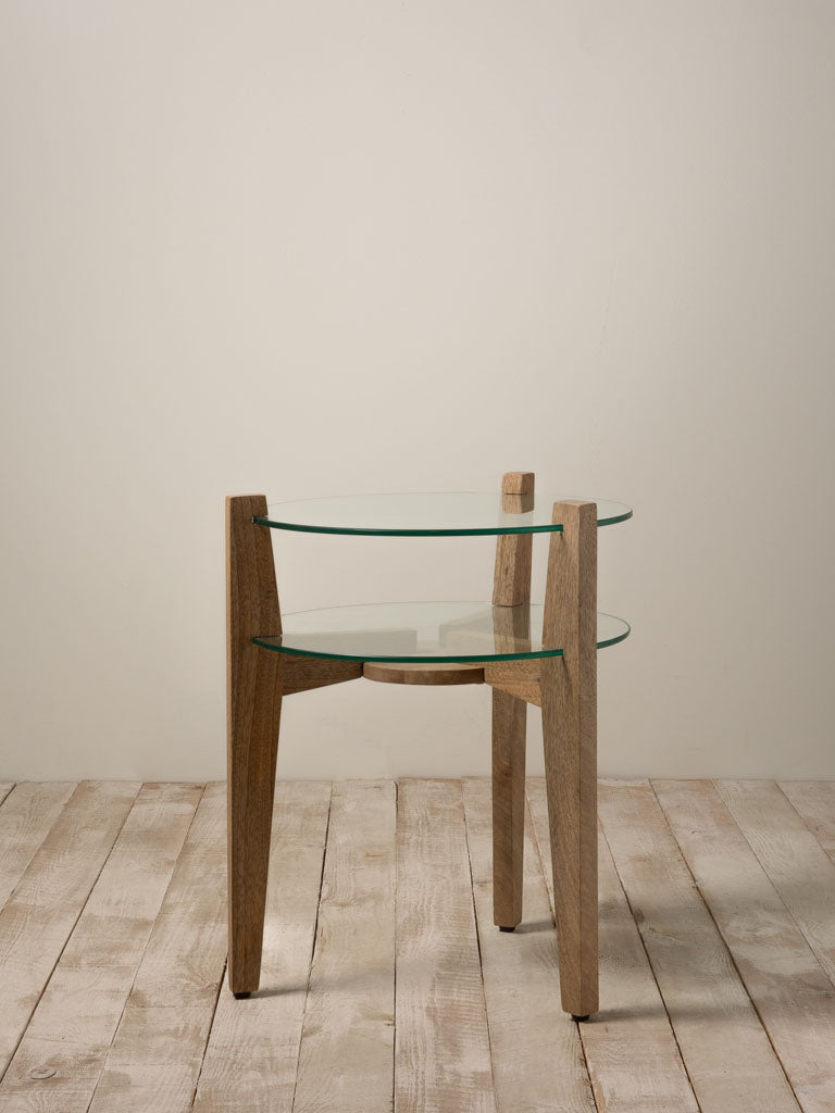 A sculptural side table that marries form and function. Two generous glass shelves rest on a mango wood frame, creating visual lightness while the natural wood grain anchors the piece. At 55cm diameter and 45cm height, it commands presence without overwhelming a space. The transparent shelves showcase objects beneath while the warm timber base grounds the design—ideal for displaying ceramics, books, or simply anchoring a corner with understated elegance.