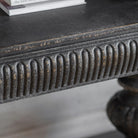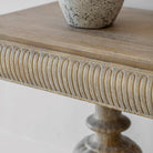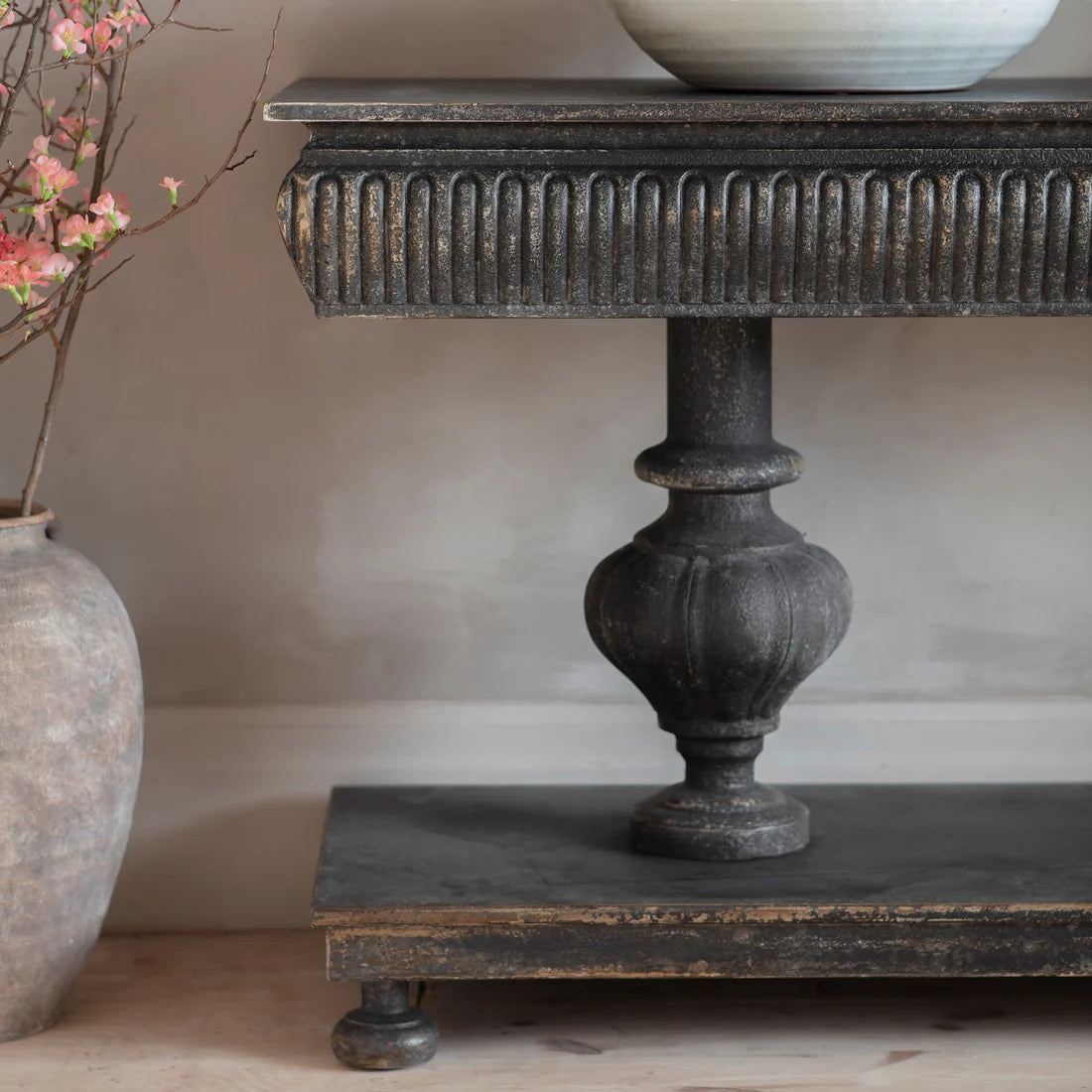 The Abbey Console Table showcases expert craftsmanship with its pine and engineered wood construction and a gently weathered finish. Measuring 186cm wide, 84cm high, and 56cm deep, it offers a spacious surface ideal for displaying lamps, books, or decorative items. Its carved apron and turned baluster-style legs, separated by an 84cm span, rest securely on a solid plinth base. This table’s natural tones and sculptural details make it a sophisticated centerpiece for traditional, rustic, or transitional interiors.