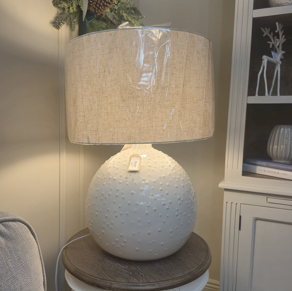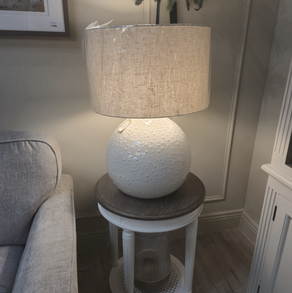 Sculptural ceramic base with organic pimpled texture brings tactile interest to any room. Paired with a natural linen shade, this table lamp delivers warm, diffused light ideal for reading or ambient evening settings. The 200cm white flex offers flexible positioning, while the 60W capacity ensures adequate brightness without overwhelming. IP20 rating suits indoor use. A refined accent piece that balances form and function for contemporary interiors.