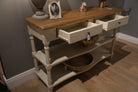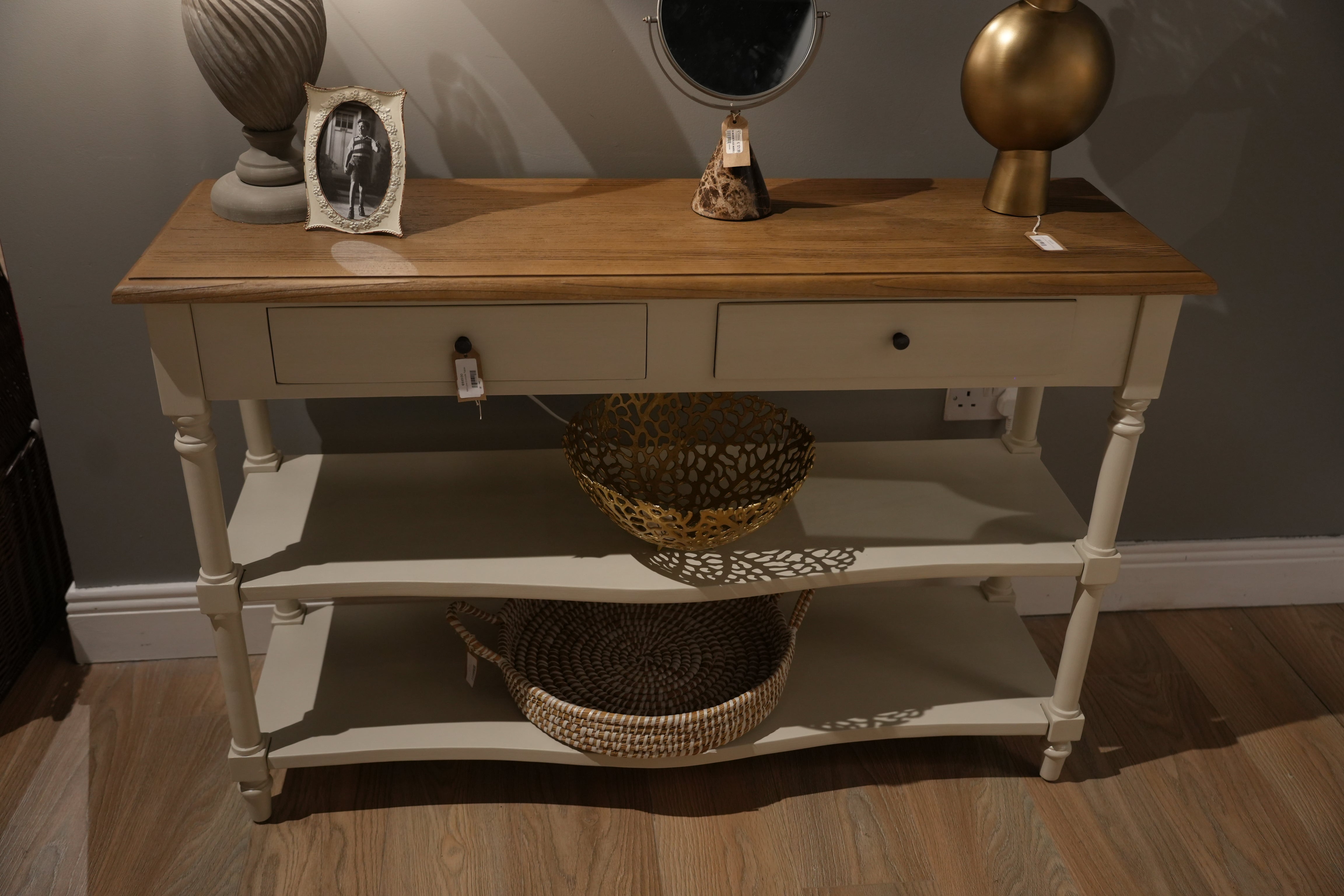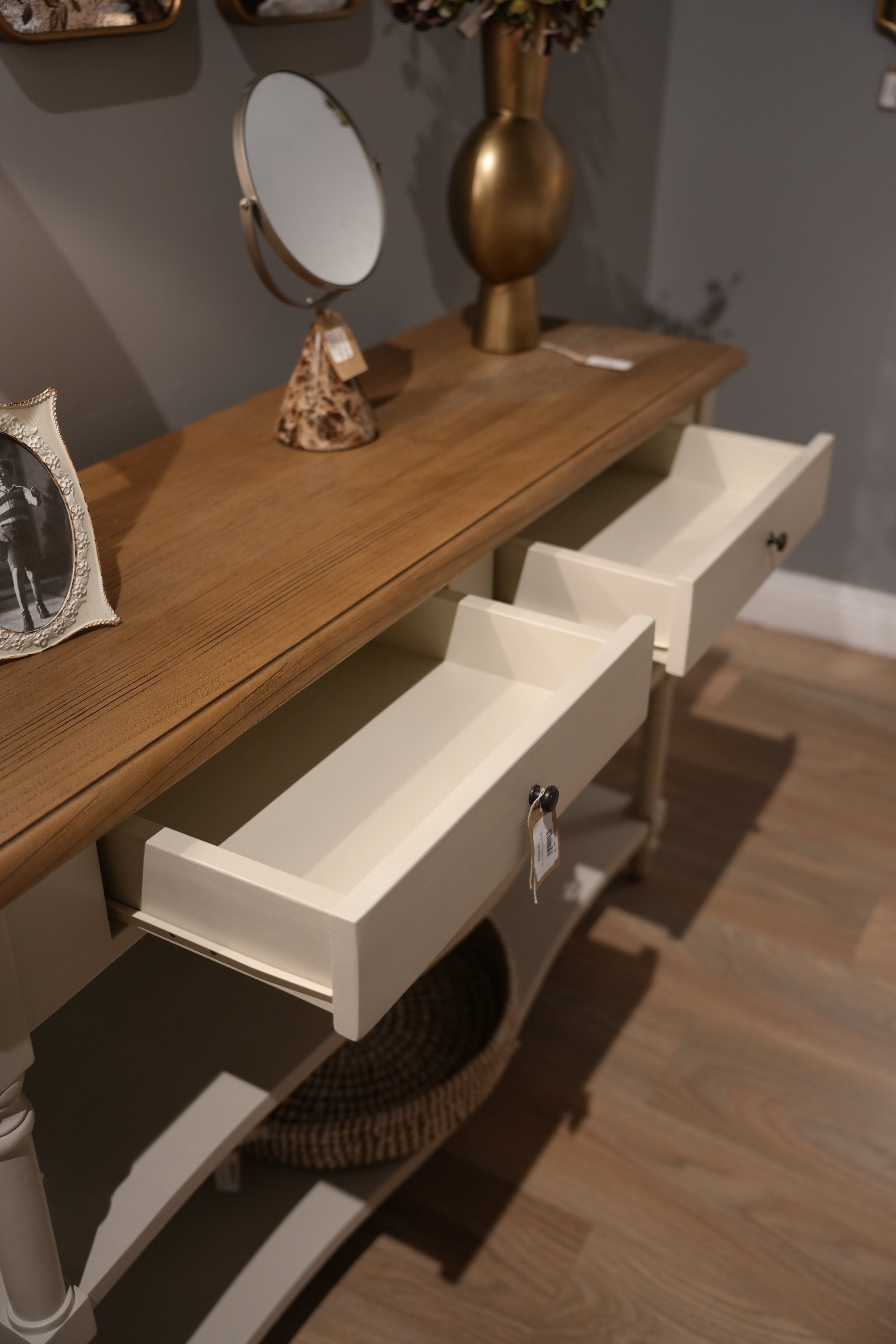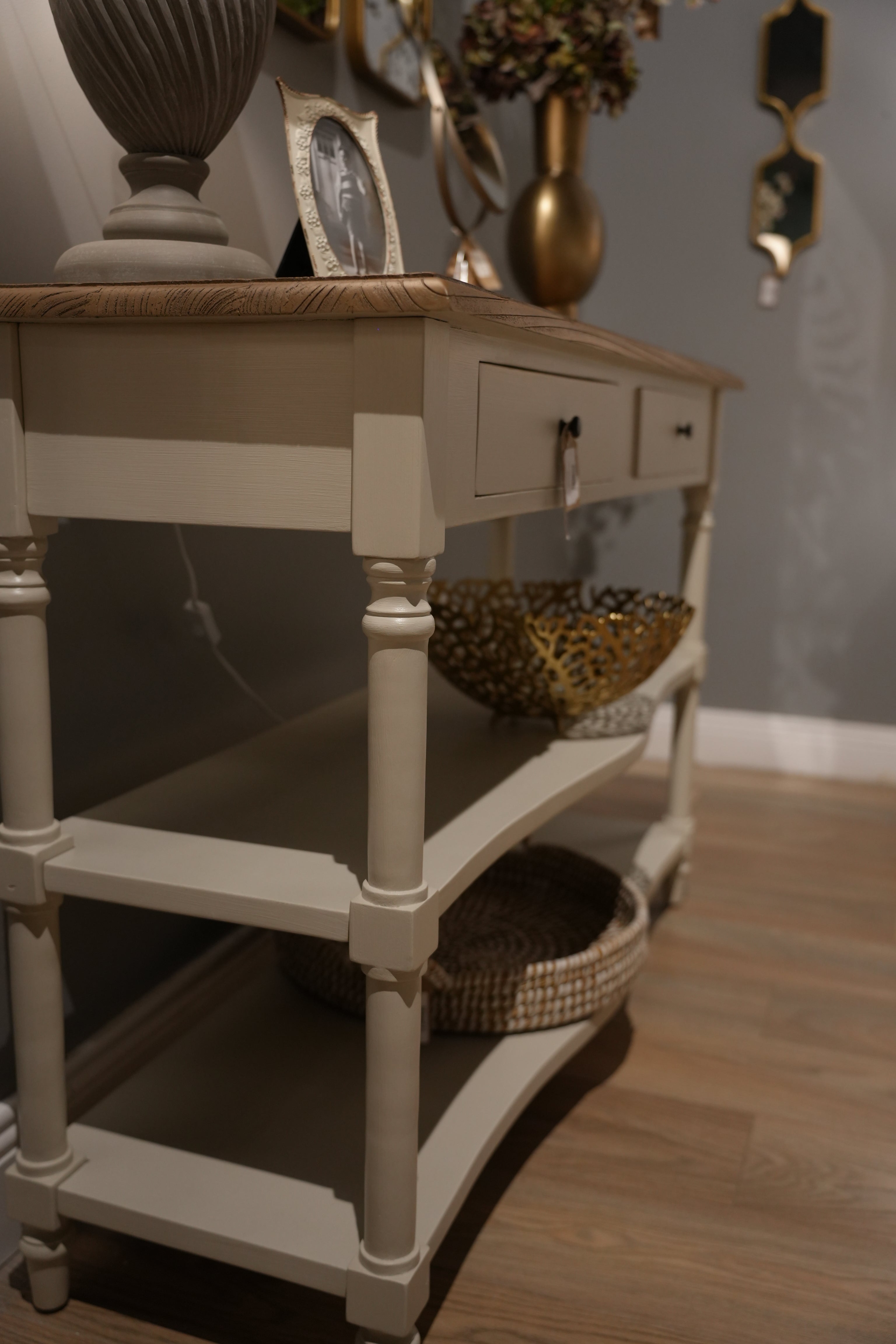 The Lyon Console Table combines timeless country style with durable craftsmanship. Crafted from 100% solid Sungkai wood, also known as Pacific oak, this piece offers lasting strength and natural beauty. Finished in a subtle Cornforth white paint, it provides a clean, versatile look perfect for enhancing any entryway or living space with understated elegance.