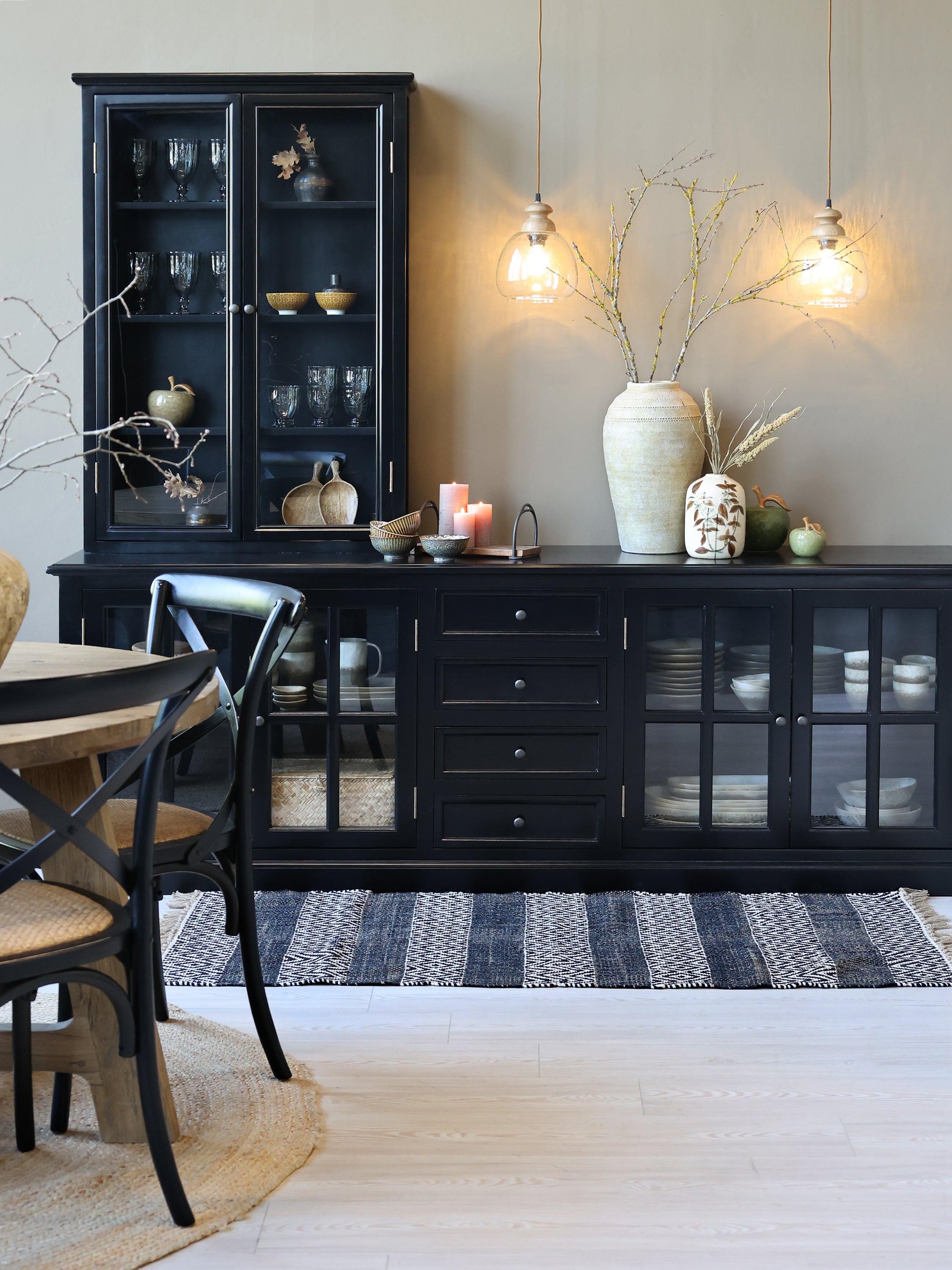 The Marseille Display Cabinet combines classic design with functional storage, featuring four spacious drawers and four glass-fronted doors for elegant display. Crafted from solid poplar wood with visible grain and durable plywood, it offers a warm, timeless appeal. Shelves are spaced 31 cm apart to accommodate a range of items. Weighing 77 kg, this sturdy piece is available in natural, white, and black finishes, making it a versatile addition to any interior.