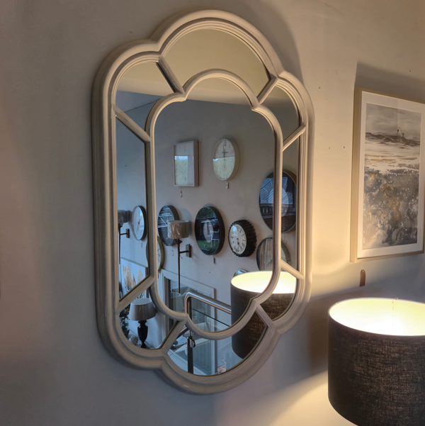 The Ebba Mirror enhances any room by reflecting natural light and creating a sense of spaciousness. Its delicately distressed pale grey finish adds subtle character, making it a versatile piece for various interiors. Measuring 80cm wide by 120cm high, the mirror can be easily mounted on a wall or elegantly propped on a surface for flexible styling options.
