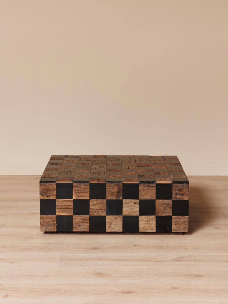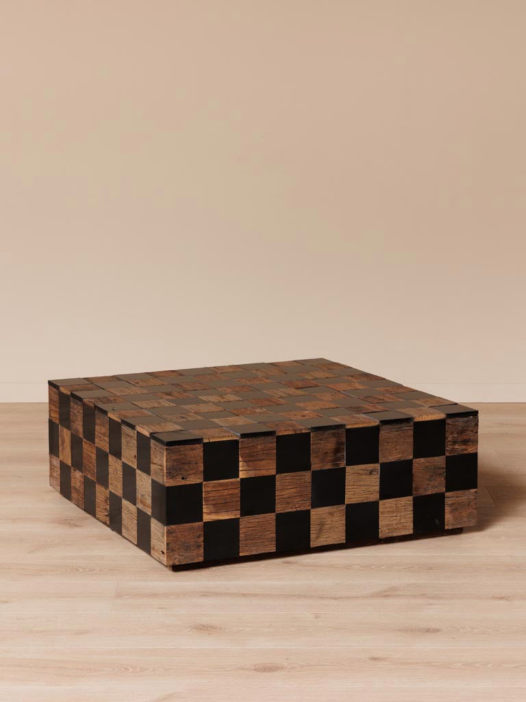 The Kadrie Square Coffee Table combines vintage charm with sustainable materials, featuring a 90 x 90 cm surface crafted from elegant marble and recycled wood. Its chessboard-inspired design with alternating wooden and black squares adds a timeless, sophisticated touch to any living space. Standing 33 cm high, this sturdy square table offers both style and functionality, making it an expert choice for those seeking a unique centrepiece that balances aesthetics with eco-conscious craftsmanship.