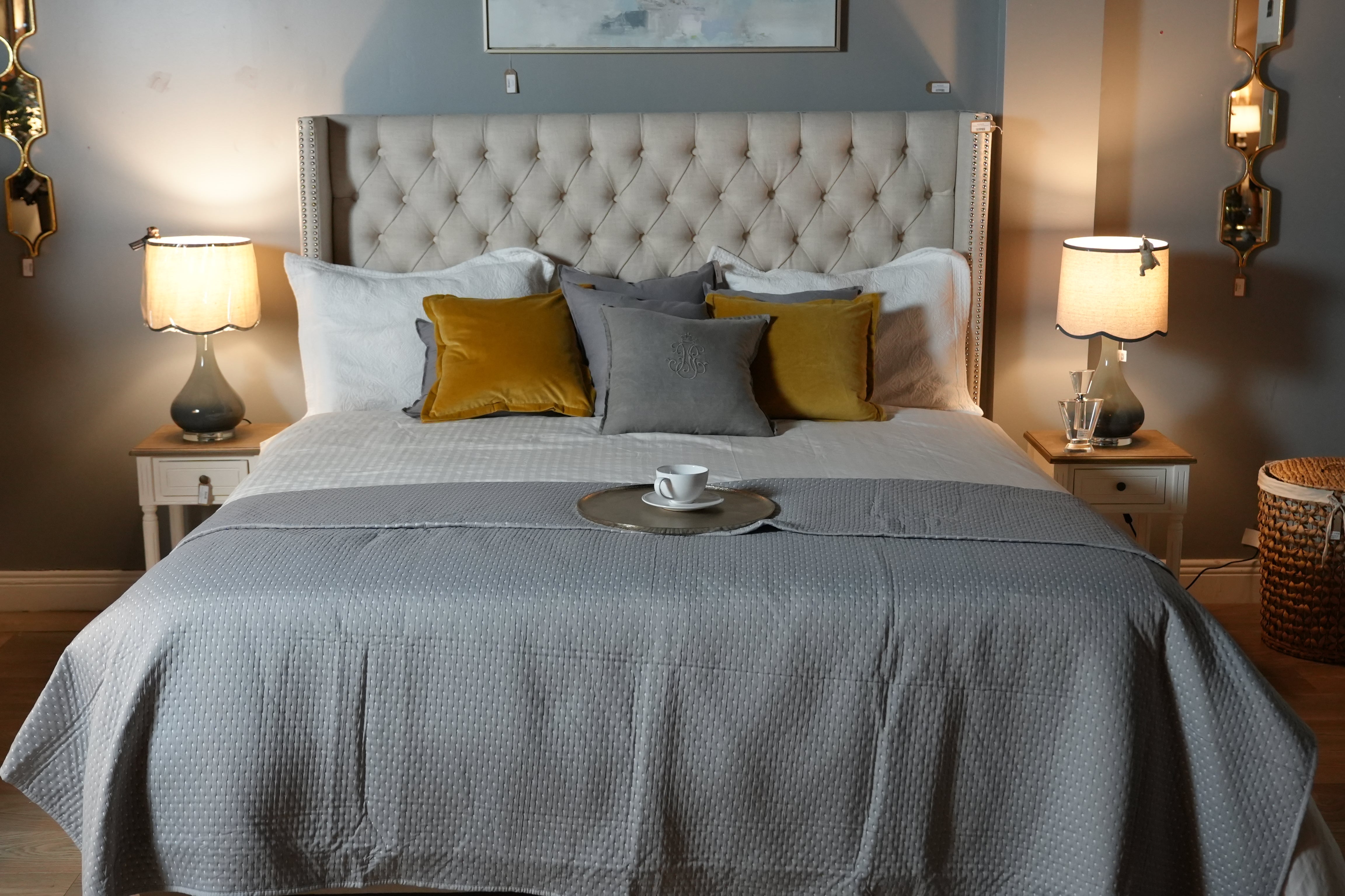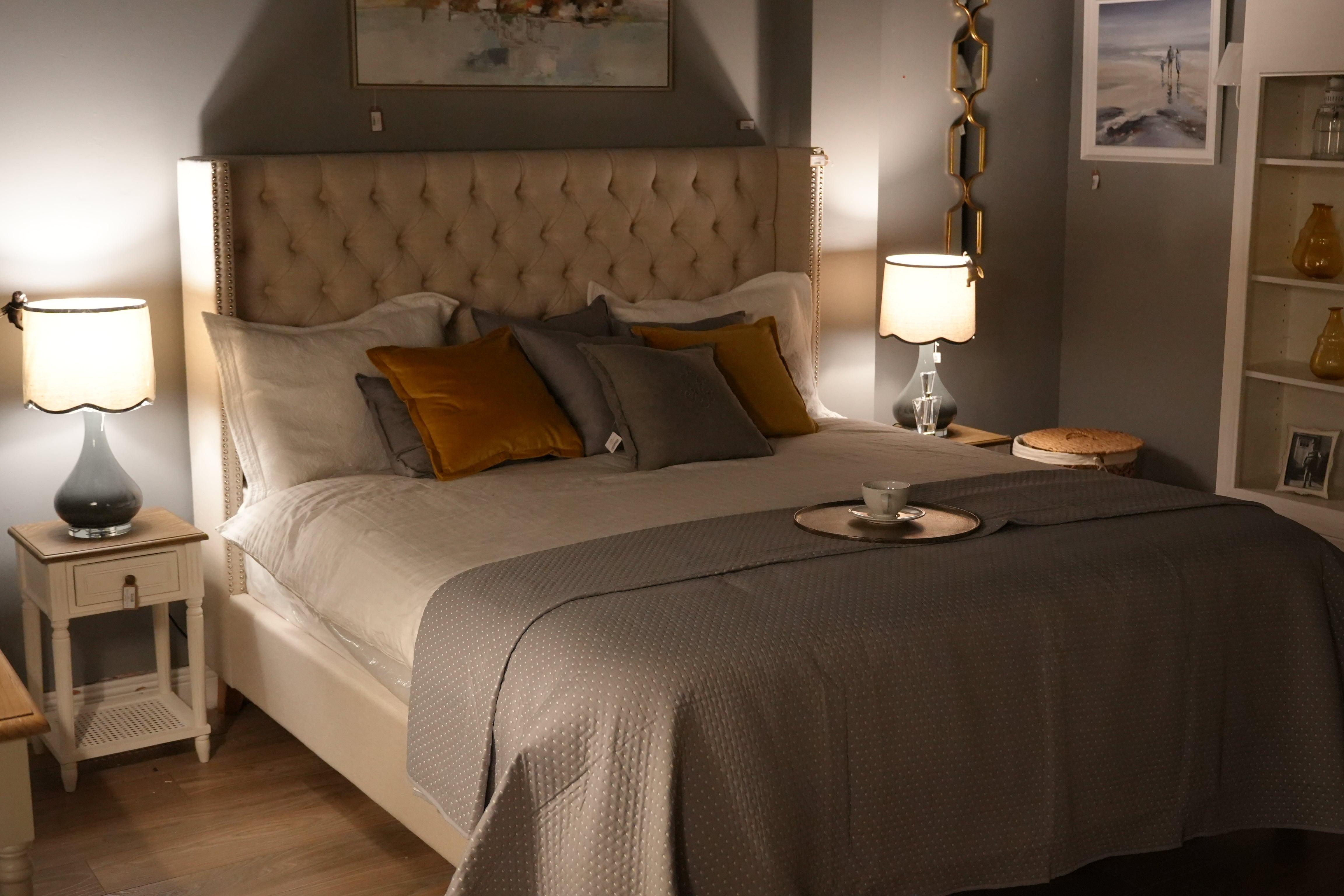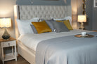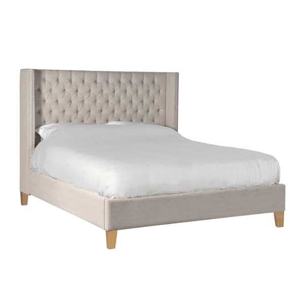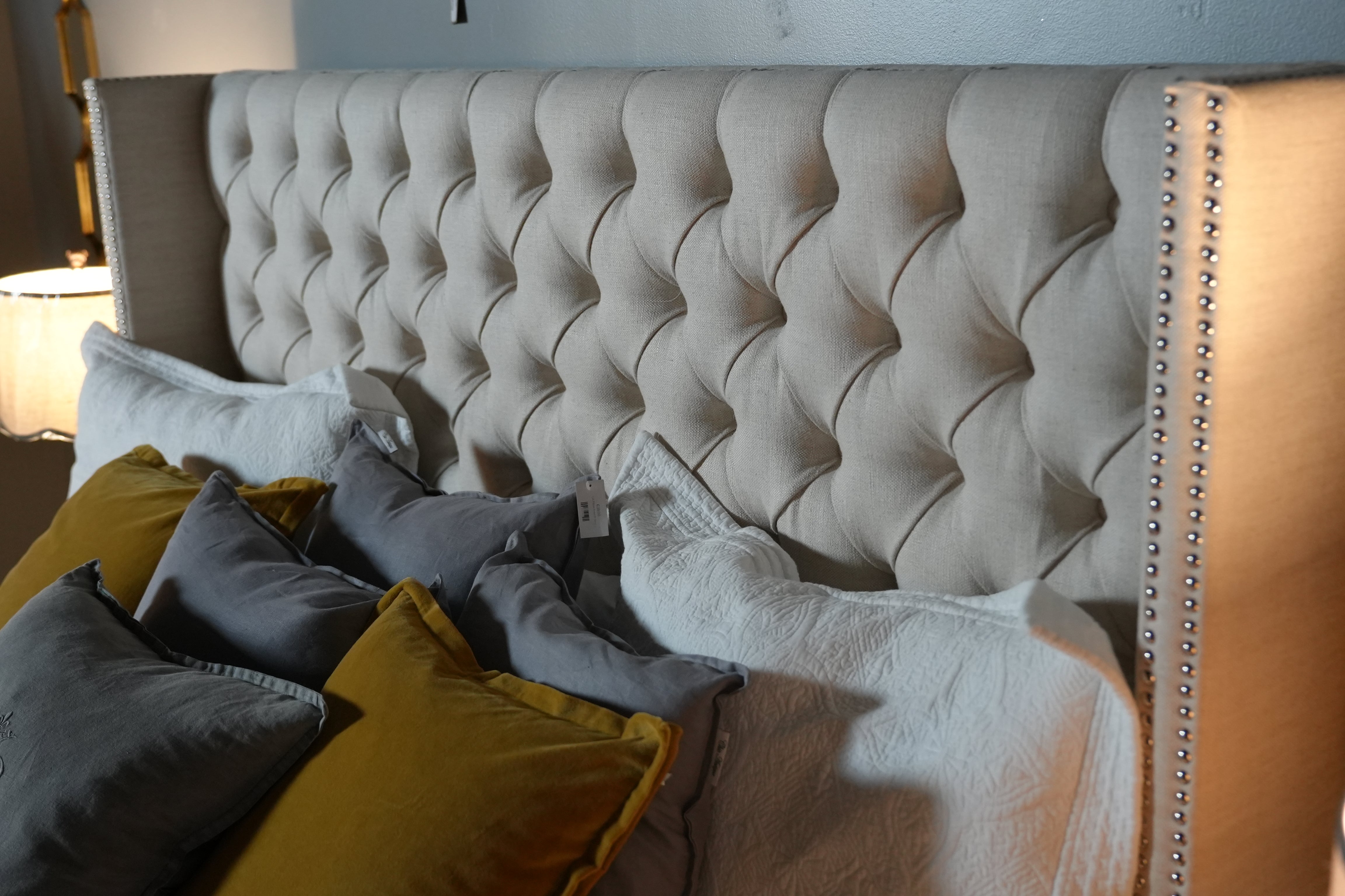 Canadian Pinewood 6ft Button Bed (Display) Crafted from solid Canada pine and plywood, this substantial bed frame combines structural integrity with timeless appeal. Upholstered in 100% linen with button detailing, the headboard offers both visual interest and tactile comfort. The foam-filled construction ensures durability and support, while the generous proportions, measuring 2160mm long, 1940mm wide, and 1520mm high, accommodate a standard 6ft mattress with presence. At 85kg, this is a statement piece designed for discerning interiors where quality materials and considered craftsmanship take precedence.