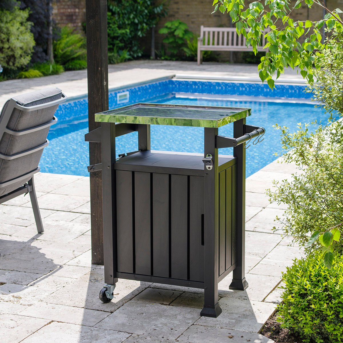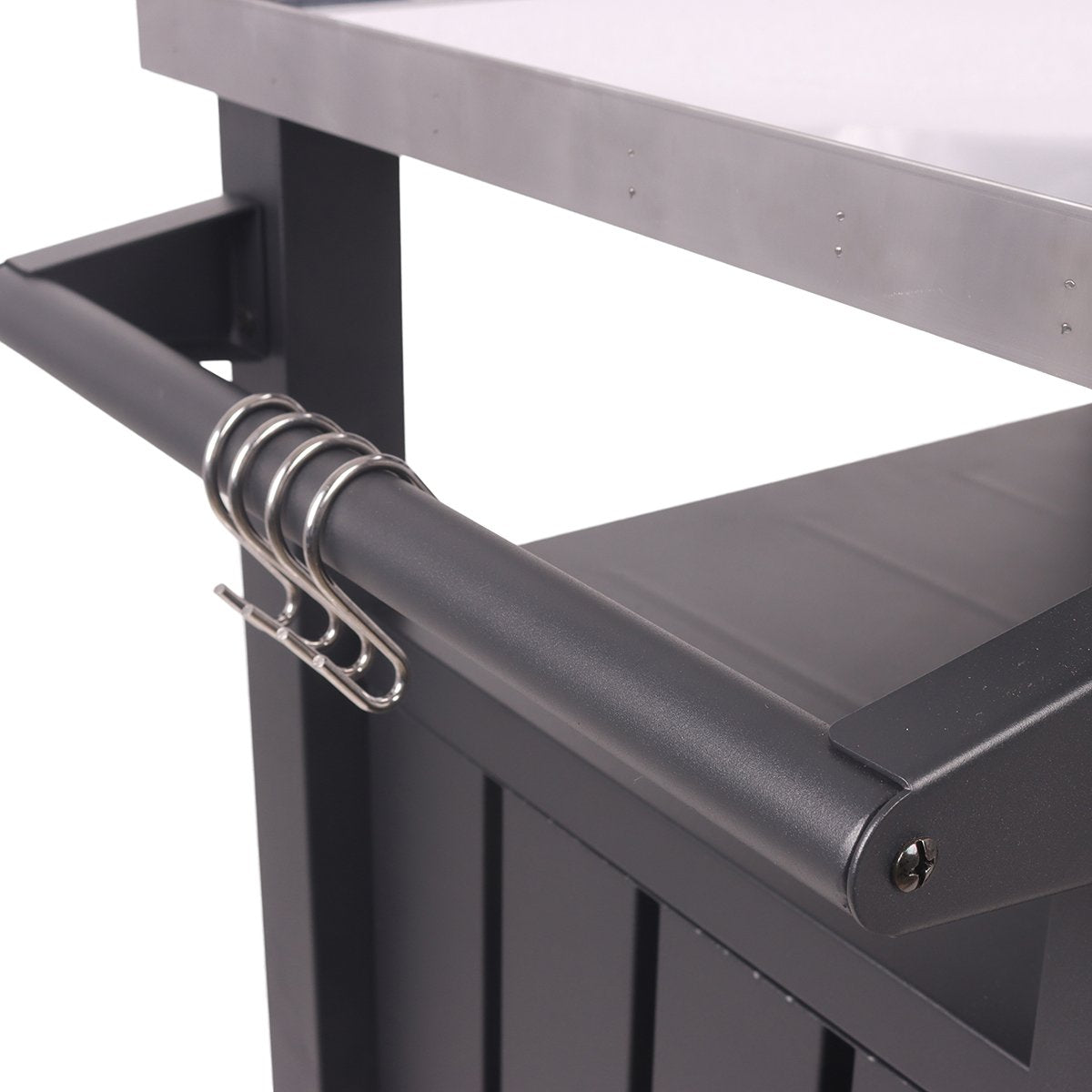 Holds either the 12″ or 16″ Casa Mia pizza oven. It is equipped with tool hooks, condiment rack, paper towel holder and bottle holder. There is even a cupboard underneath to store the gas bottle.