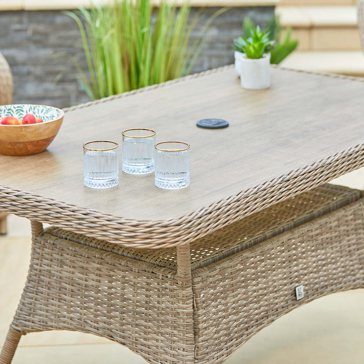 This product features Stain Resistant Fabric, Season-proof cushions, Environmentally Friendly EcoCore, 3 year Warranty, Handwoven Multi-toned Hook Poly-Rattan with authentic wicker effect, Twisted Rod Weave Trim, UV resistance, Powder Coated Lightweight Frame, Strengthened Ceramic Coated Safety Glass, Adjustable table height.