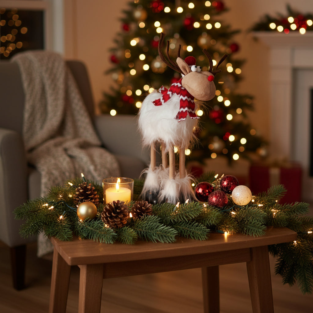The Christmas White Furry Reindeer stands approximately 0.54 meters tall, 0.40 meters wide, and 0.13 meters deep. Crafted to add a festive touch, its soft white fur and elegant design make it an ideal decorative piece for your holiday décor. Perfect for creating a cozy and sophisticated seasonal atmosphere.