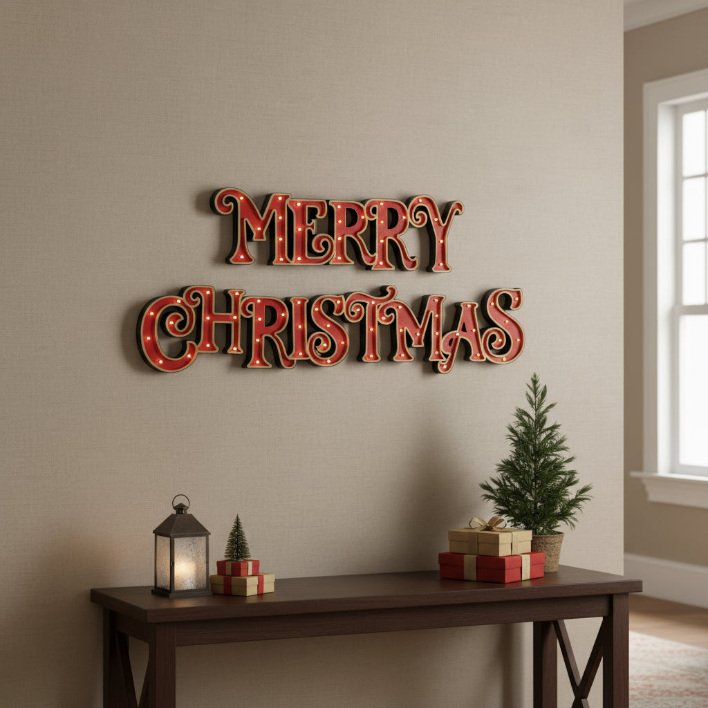The Christmas Rouge Lit Merry Christmas has dimensions of 0.35 meters in height and 2.6 meters in width, providing an ample size perfect for making a bold holiday statement.